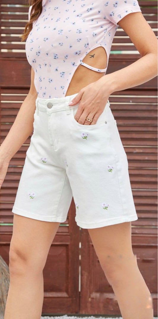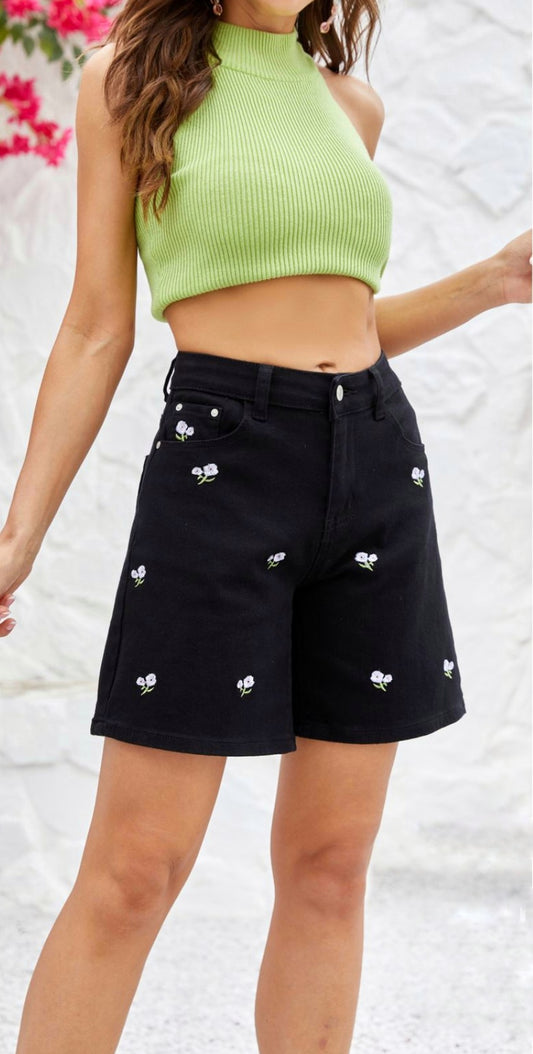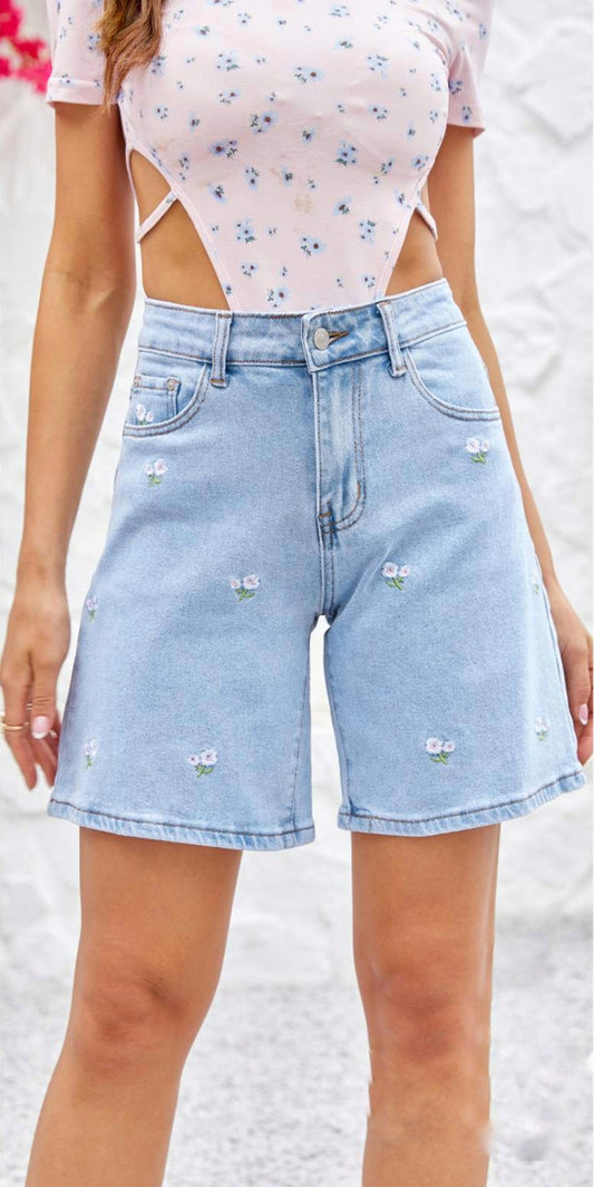 Ψηλόμεση τζιν βερμούδα με κέντημα ανθάκια