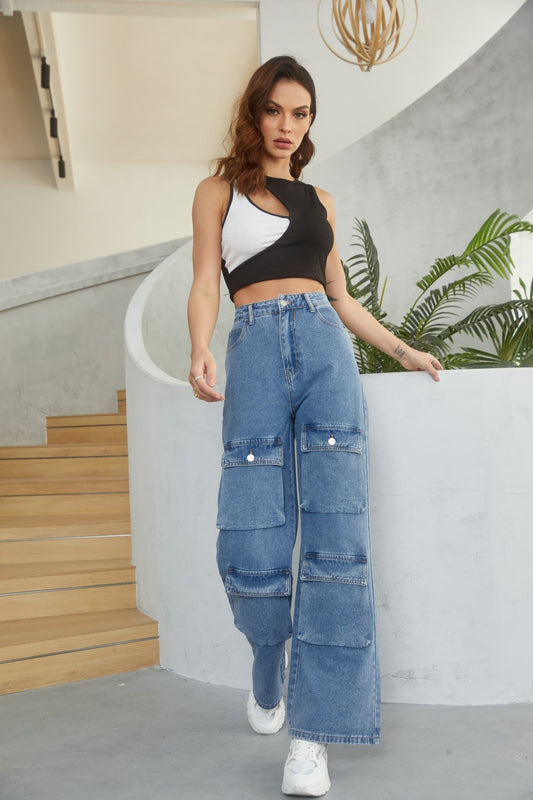 • Τζιν παντελόνι ψηλόμεσο φαρδύ με λεπτομέρειες τσέπες σε όλο το μήκος.Κανονική εφαρμογή.