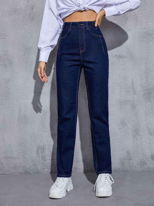 (This translates to "Photograph of a woman wearing a tight-fitting blue denim pants, perfect for creating casual and chic outfits. The pants feature a mid-rise waist, slim fit, and are made of stretchy fabric for better fit and comfort during use" in Englis