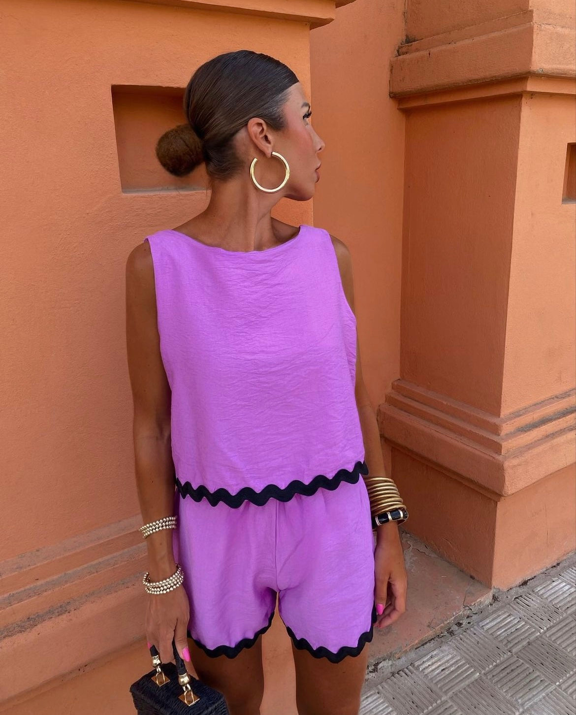Δίχρωμο σετ απο ελαστικό δροσερό ύφασμα με σορτσάκι ψηλόμεσο που διαθέτει λάστιχο στη μέση και τοπ σε άνετη γραμμή αμάνικο.Στα τελειώματα διαθέτει σχέδιο σε σχήμα κύματος απο λάστιχο.