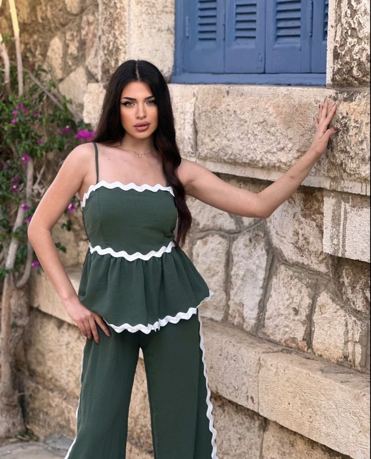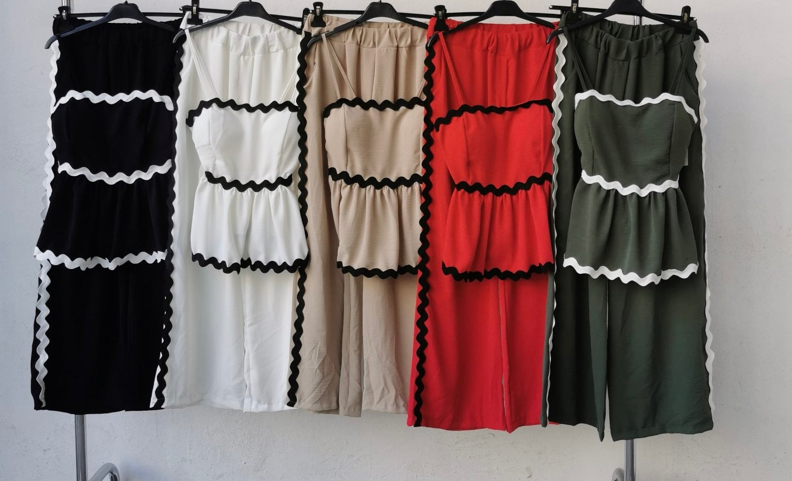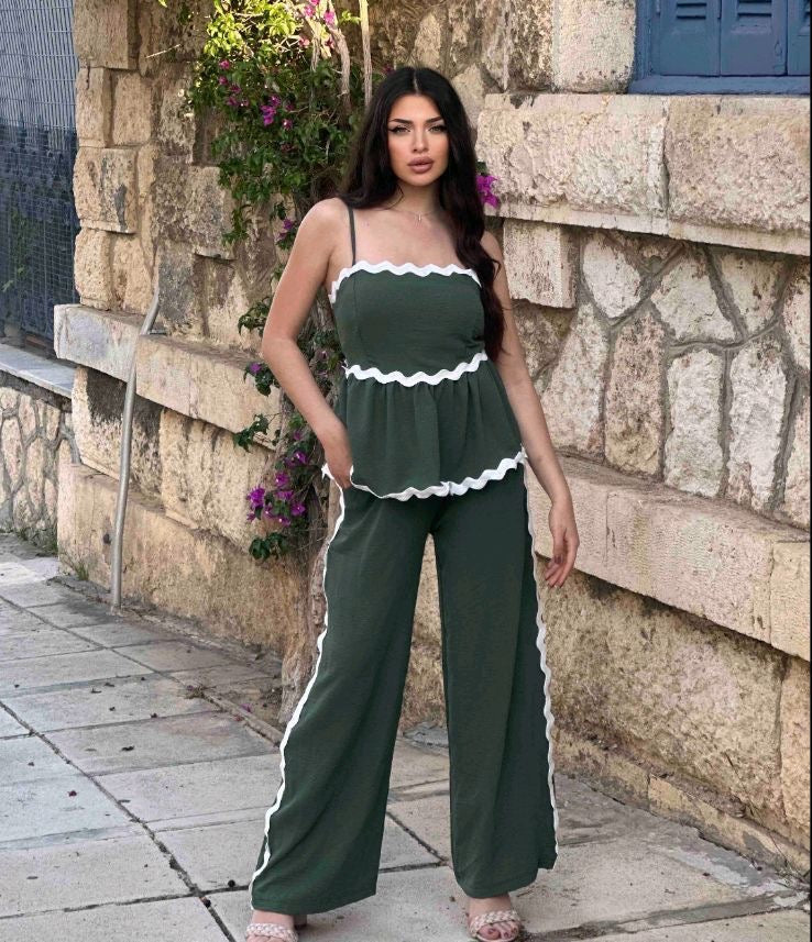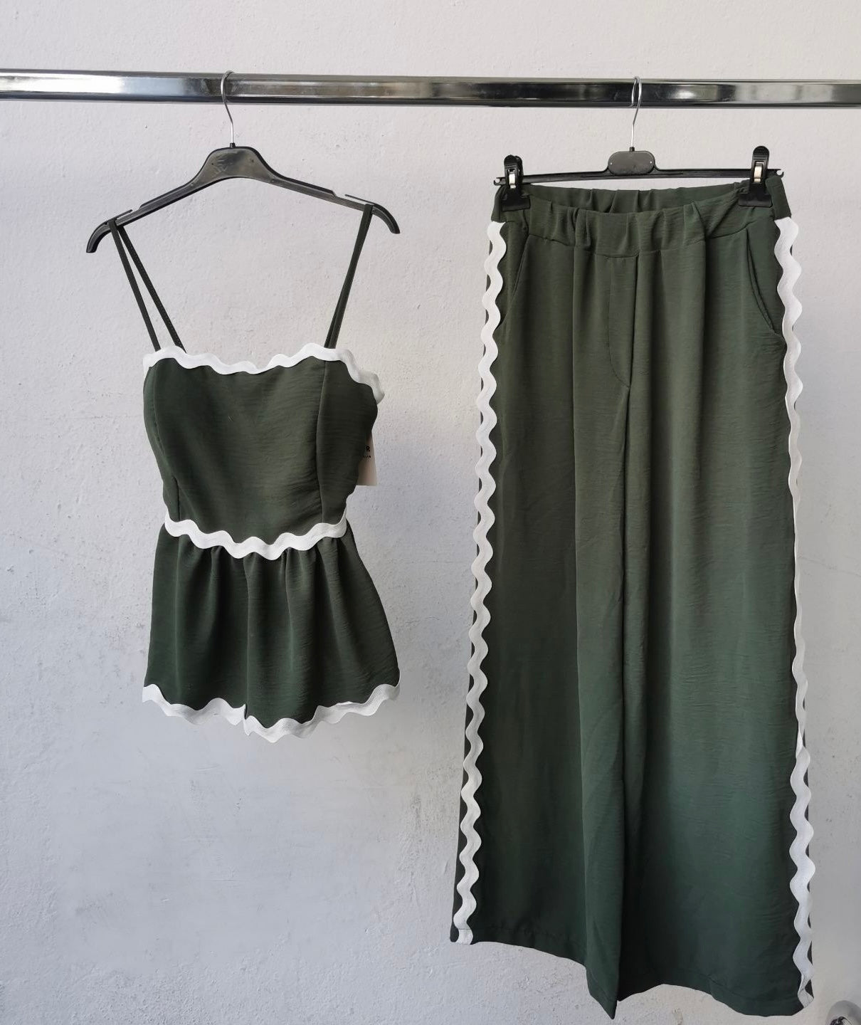 Υπέροχο κομψό σετ για τις καλοκαιρινές σου περιπλανήσεις απο αέρινο δροσερό ύφασμα κρεπ ελαστικό που δεν τσαλακώνει! Μοναδικό σχέδιο σε διχρωμία με γεωμετρικά σχέδια απο λάστιχο στα τελειώματα. Το παντελόνι διαθέτει λάστιχο στη μέση και πέφτει σε ίσια άνετη γραμμή. Το τοπ διαθετει ενίσχυση caps στο στήθος και τιράντες.