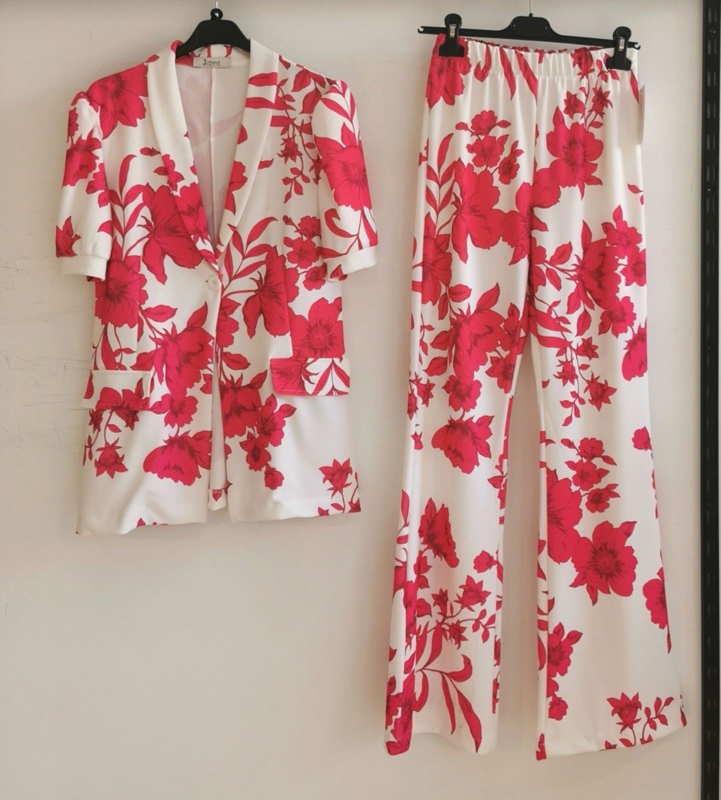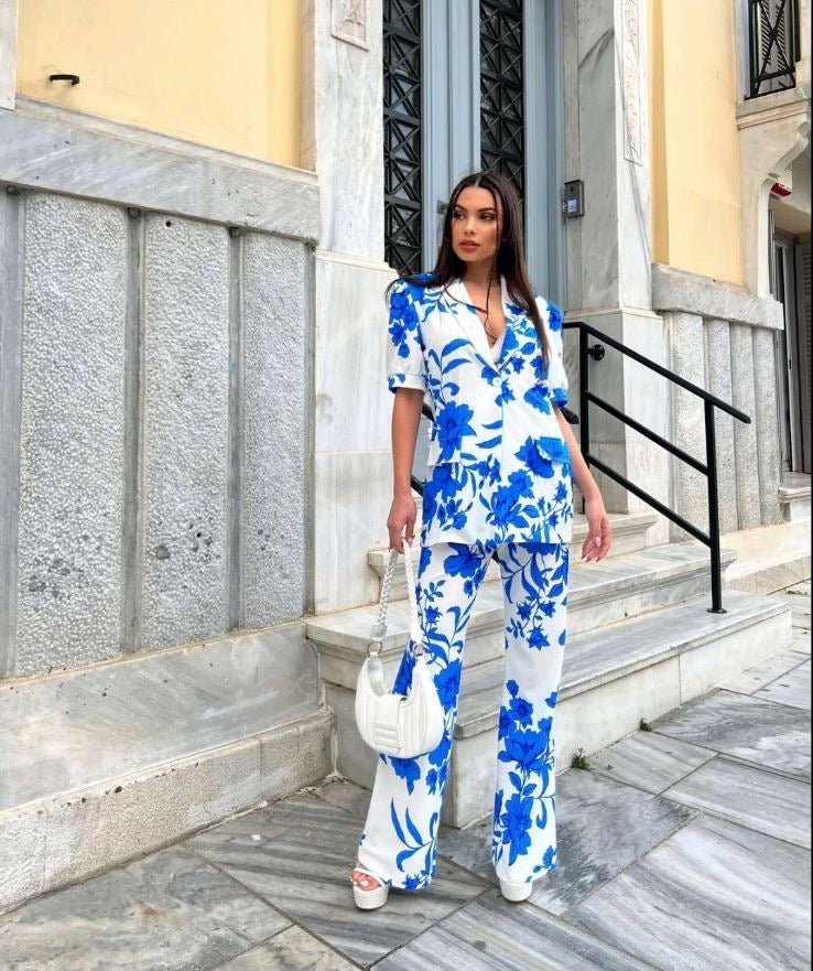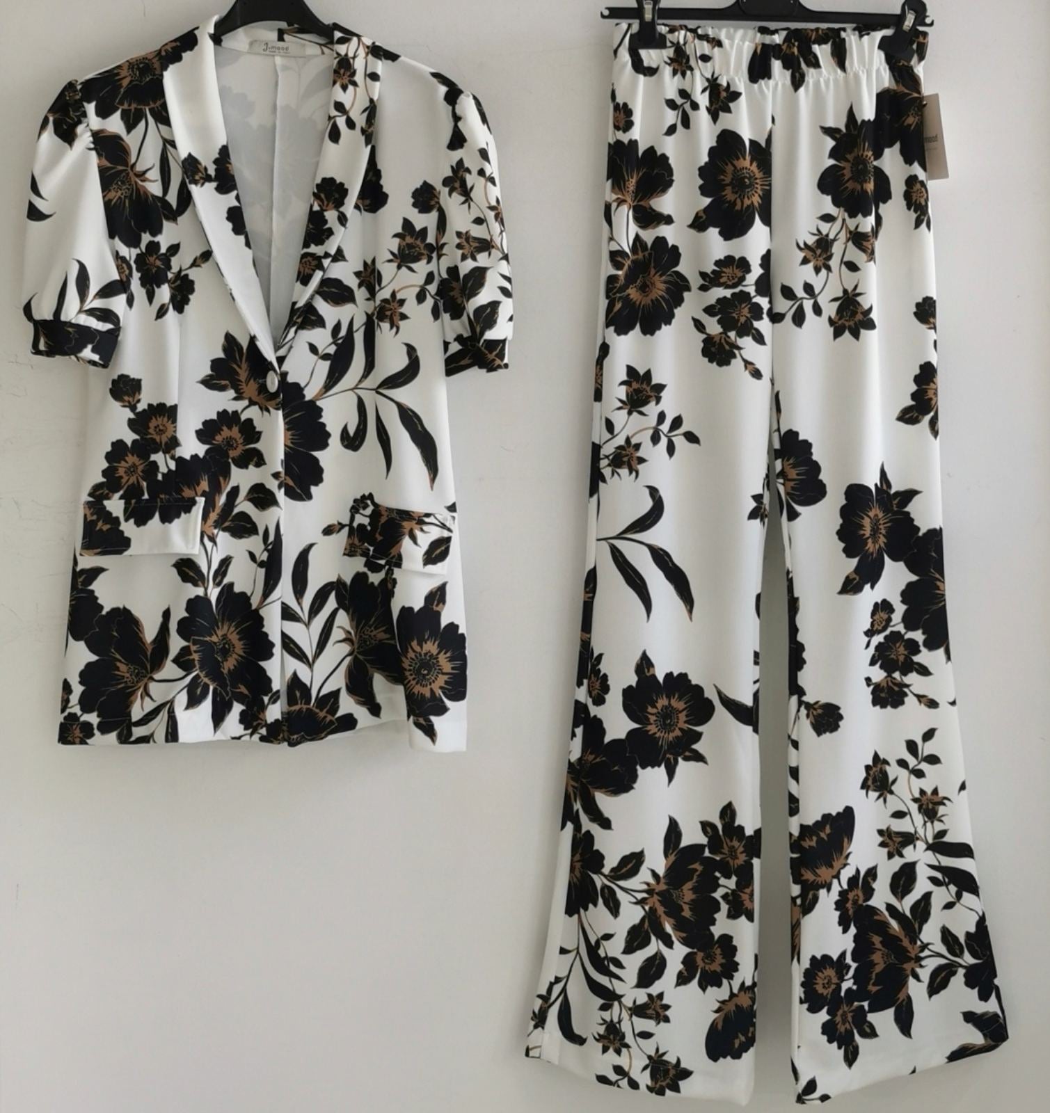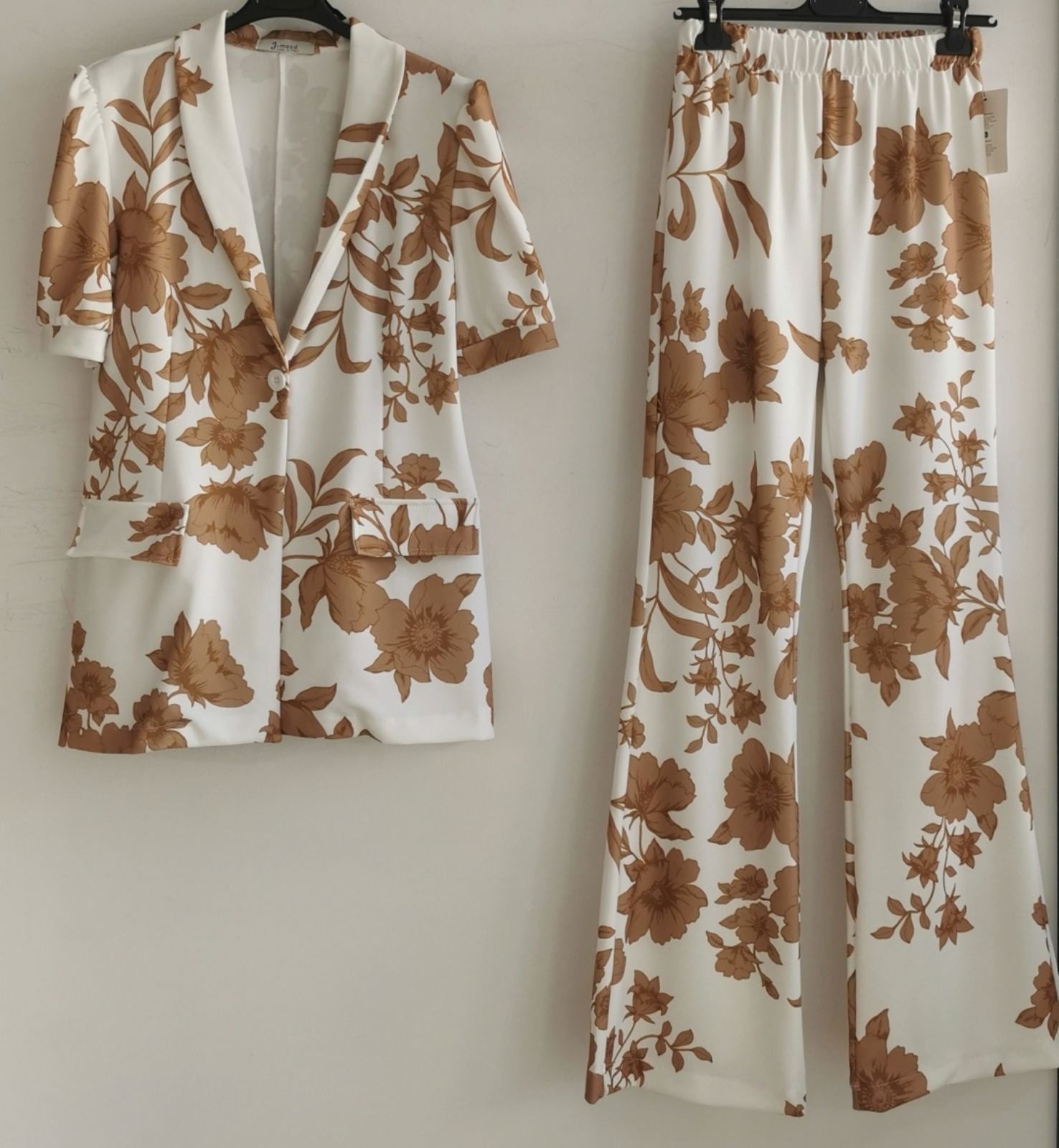 Κοστούμι φλοράλ με σακάκι κοντομάνικο και παντελόνι καμπάνα
