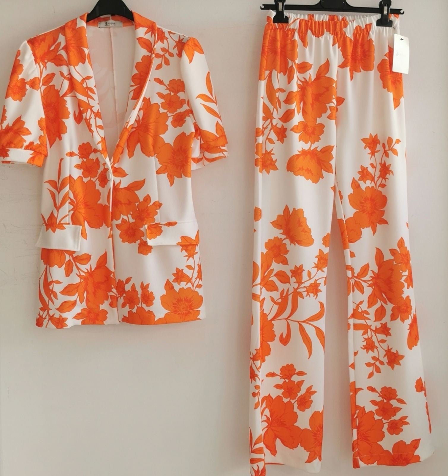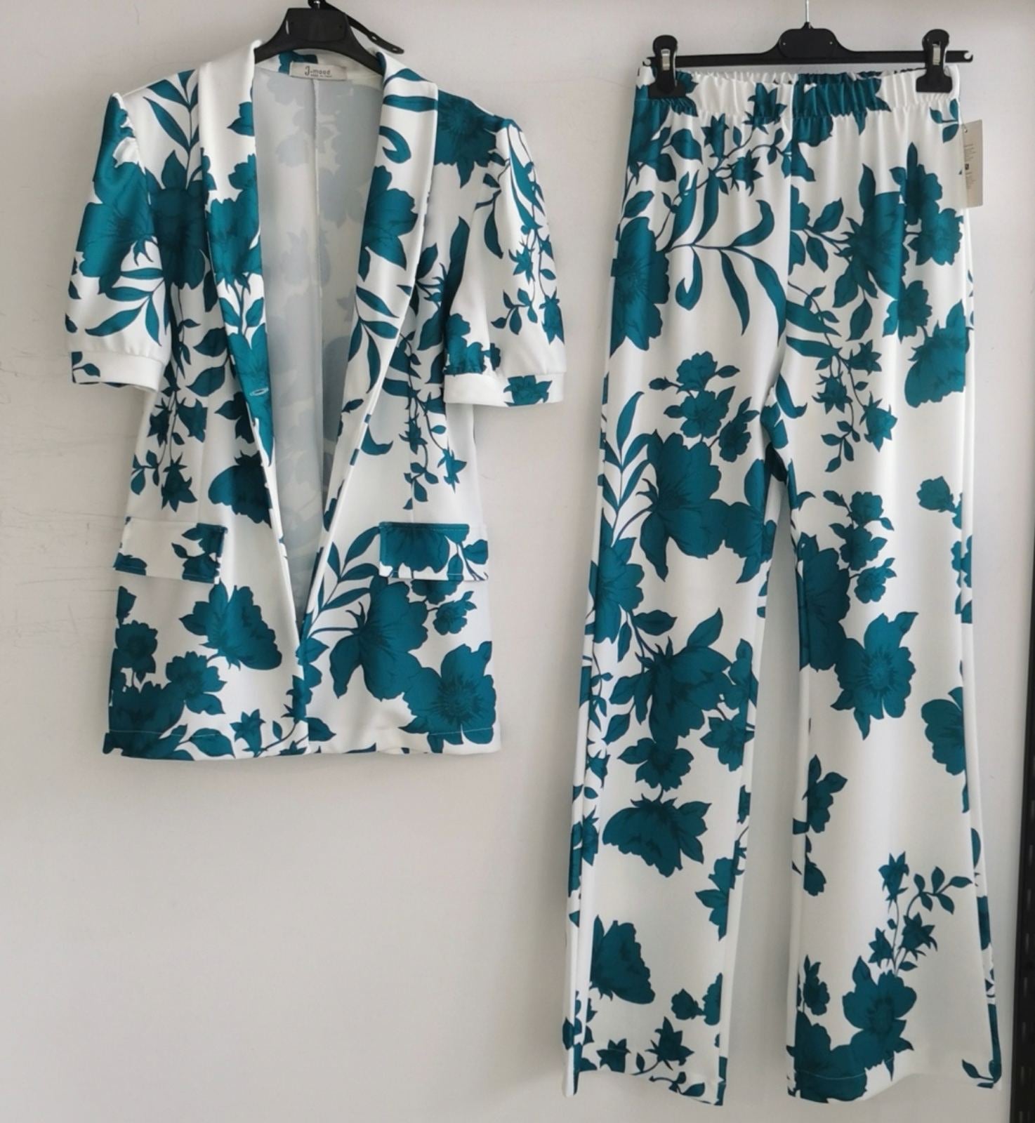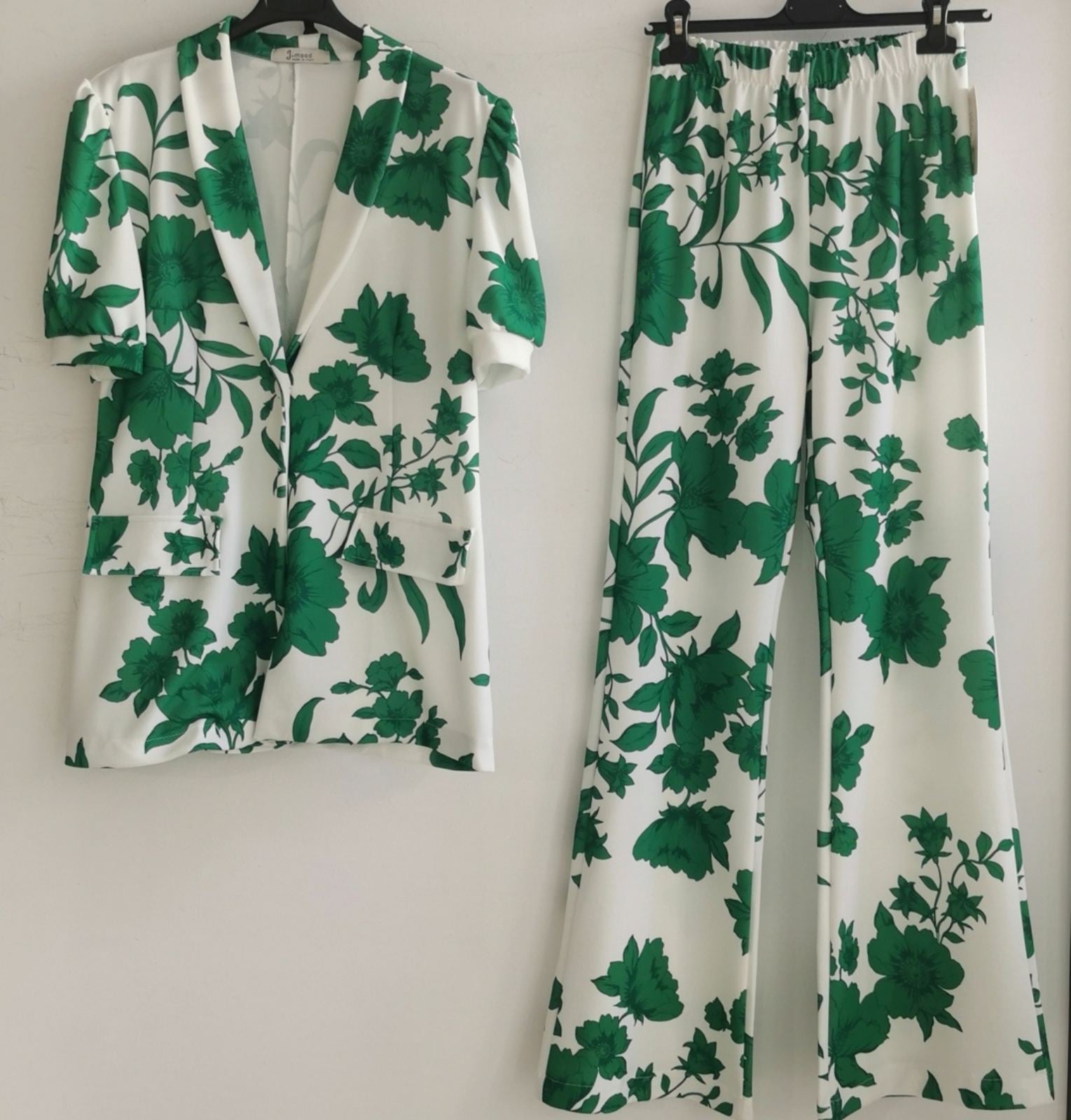 Κοστούμι φλοράλ με σακάκι κοντομάνικο και παντελόνι καμπάνα
