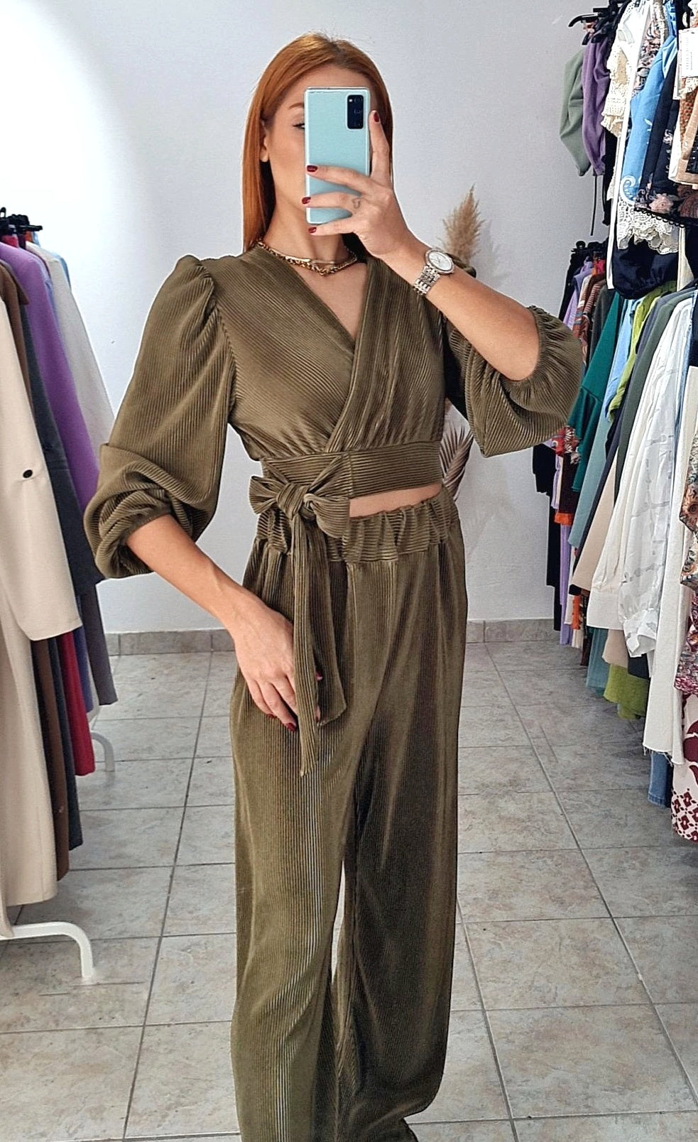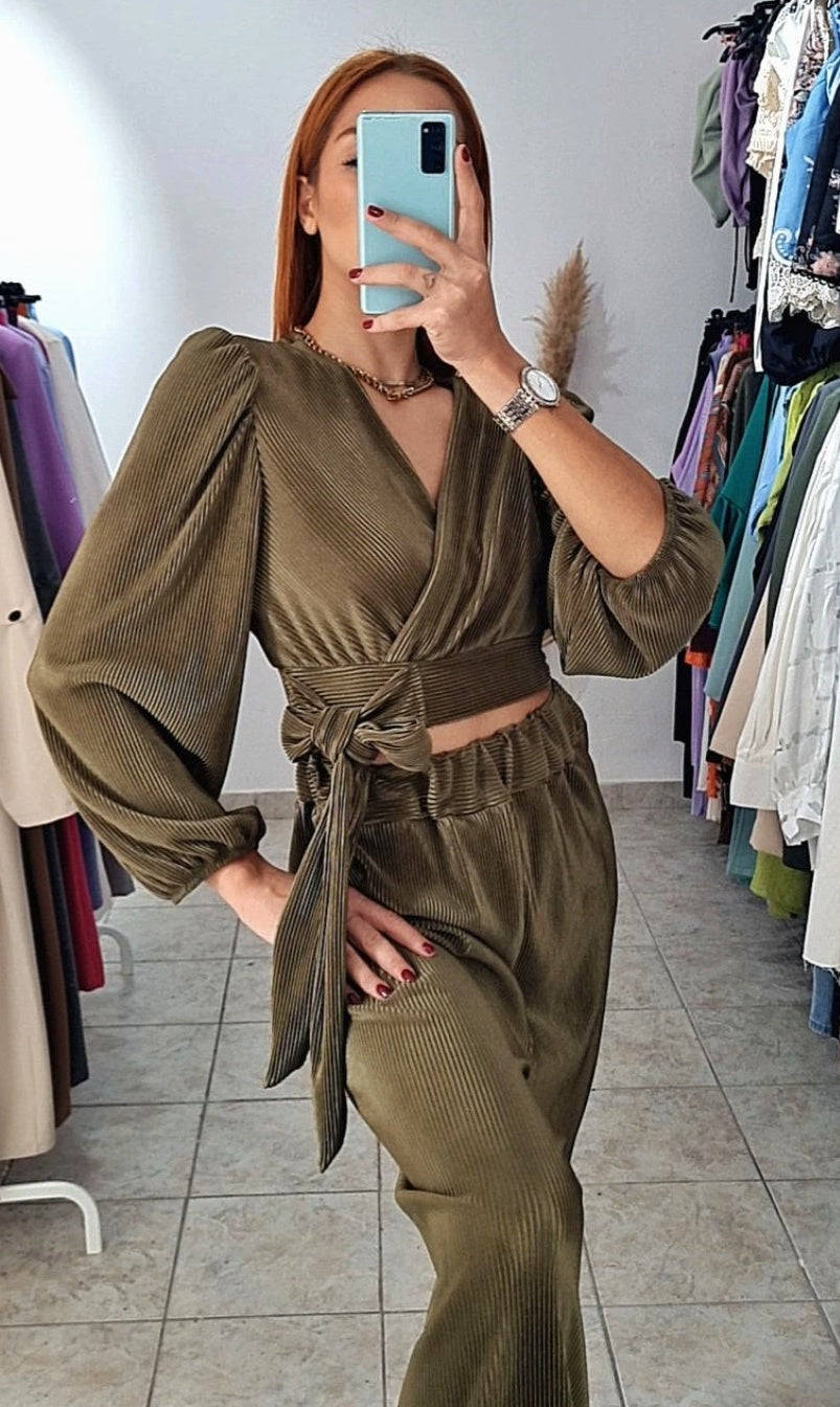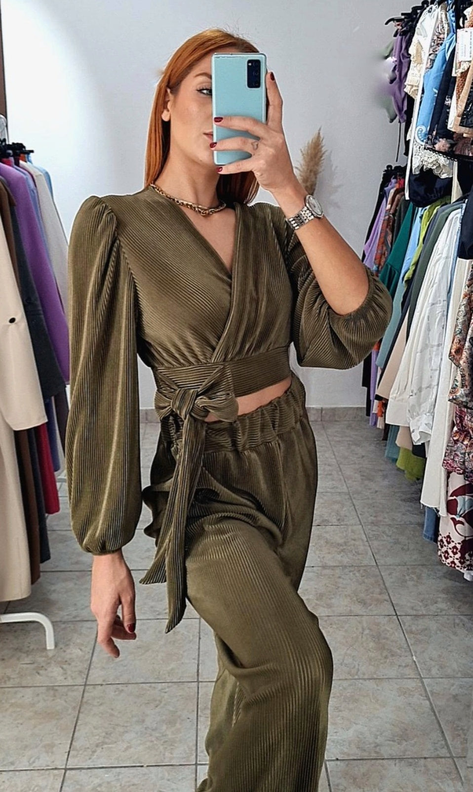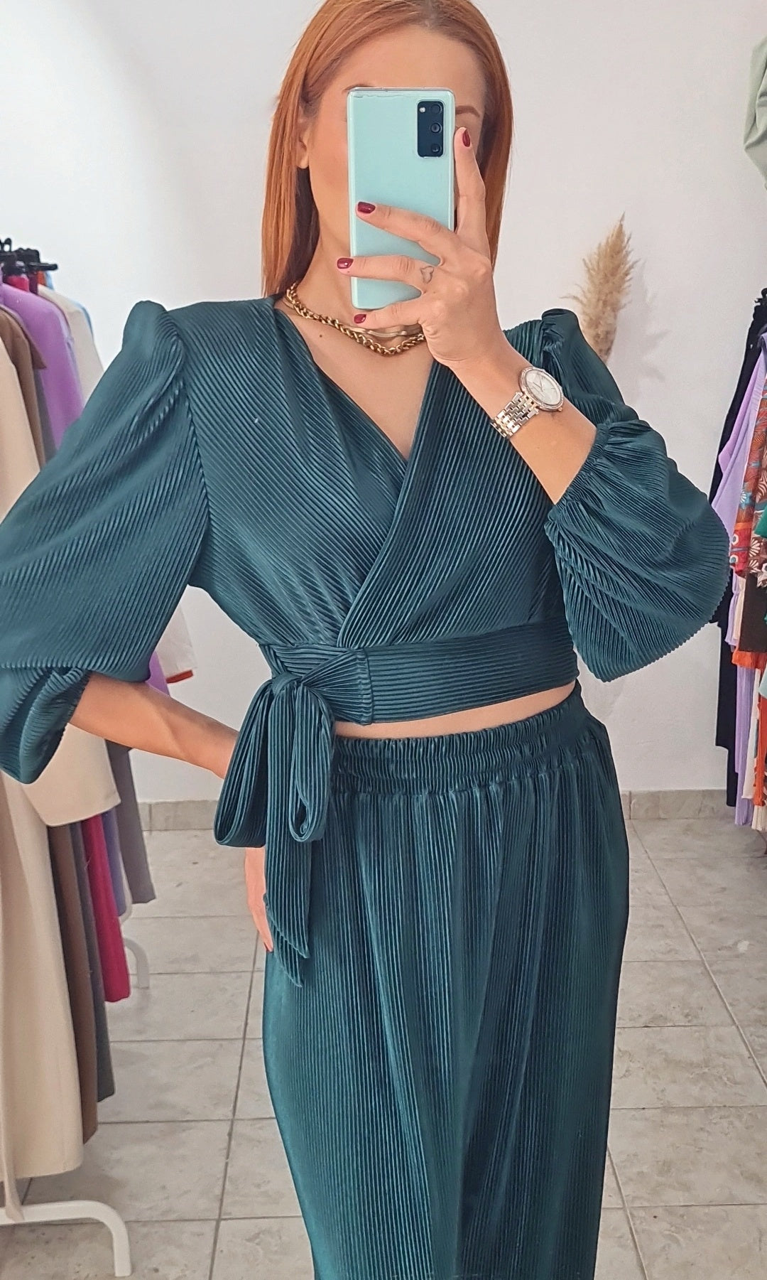 Σετ κρουαζέ από ελαστικό πλισέ σατέν ύφασμα με τοπ κρουαζέ που δένει σε φιόγκο και balloon μανίκια με λάστιχο στο τελείωμα.
