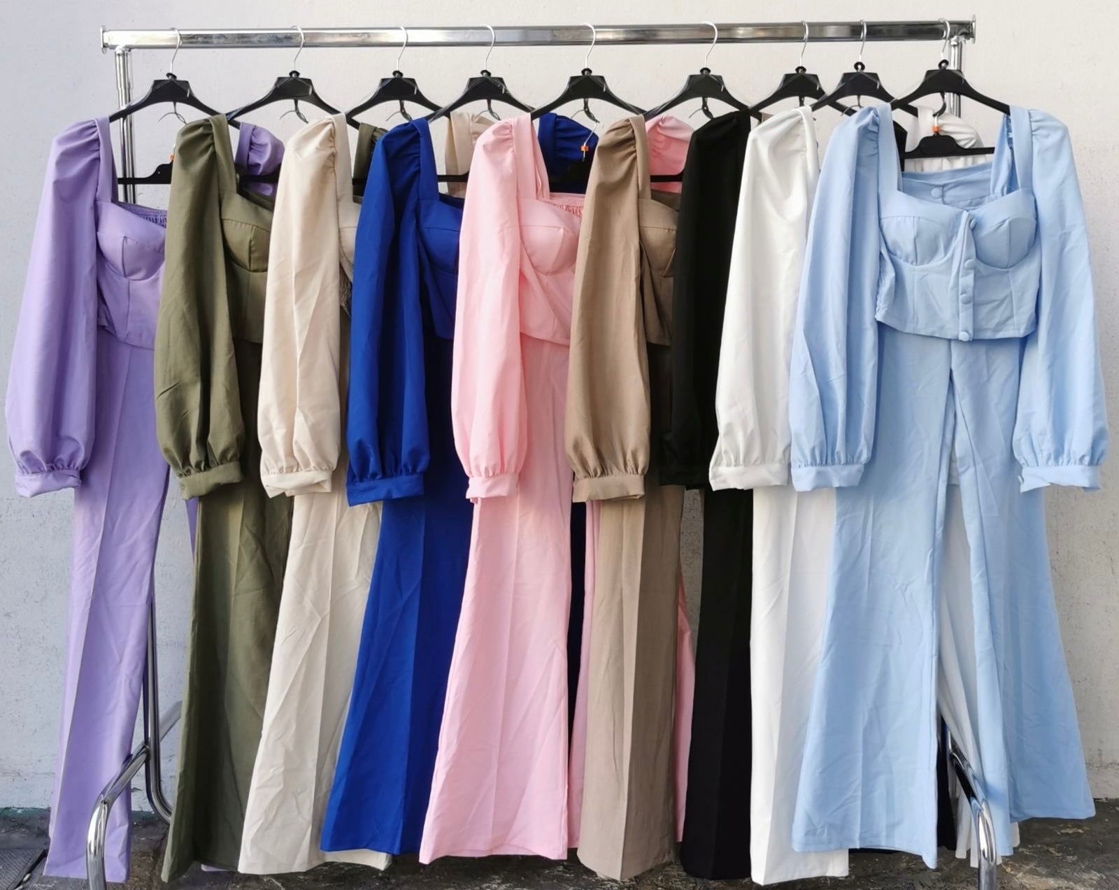 Σετ με μπλούζα με φουσκωτά μανίκια τύπου κορσέ που διαθέτει ενίσχυση στο στήθος και κουμπάκια μπροστά. Στο πίσω μέρος διαθέτει λάστιχο σφηγκοφωλιά. Το παντελόνι είναι ψηλόμεσο κλείνει με φερμουάρ και κουμπί και ανοίγει κάτω από το γόνατο. Σταθερό ύφασμα διαθέσιμο σε μεγέθη S M L. Διαθέσιμο σε χρώματα Μαύρο μπεζ λευκό σιέλ ροζ γκρι.