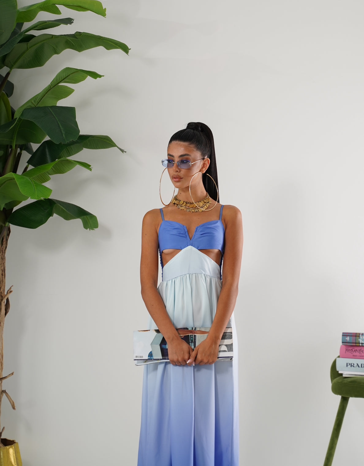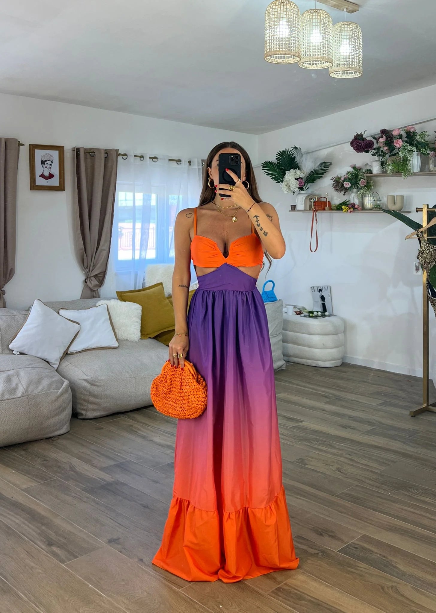 Εντυπωσιακό μάξι καλοκαιρινό φόρεμα όμπρε τιραντάκι ρυθμιζόμενο σε υπέροχους χρωματικούς συνδυασμούς με βολάν στο τελείωμα, ανοίγματα κάτω απο το στήθος, ενίσχυση με cups στο στήθος και ελαστική πλάτη σφηκοφωλιά.Ιδανικό φόρεμα για καλεσμένη ή για την έξοδό σου. Ένα μέγεθος one size  που καλύπτει μεγέθη xs s m l. Ύφασμα μουσελίνα.
