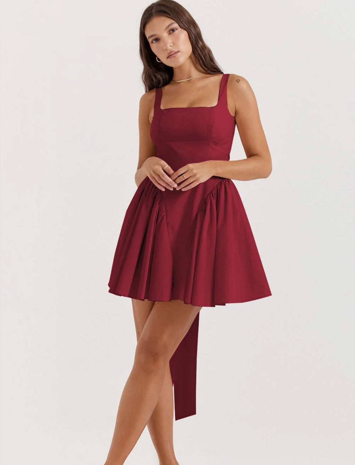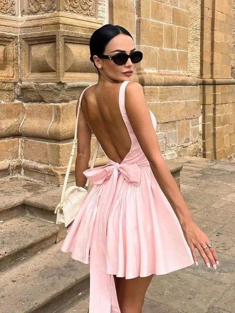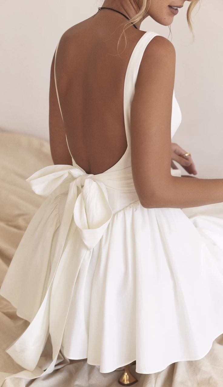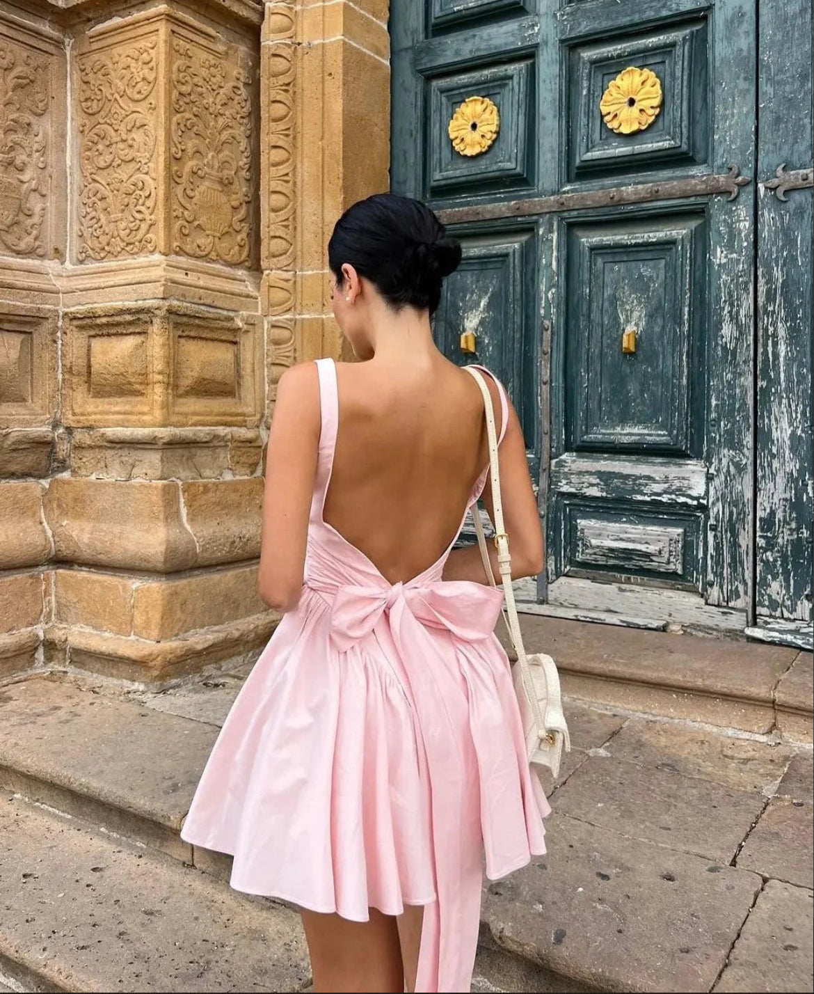 Μίνι φόρεμα με φιόγκο στην πλάτη σε άλφα princess γραμμή, μεσάτο που δένει πίσω με φιόγκο, υπέροχο μπούστο με cups που κολακεύουν το ντεκολτέ και ανοιχτή πλάτη πούτε κλείνει με φερμουάρ.