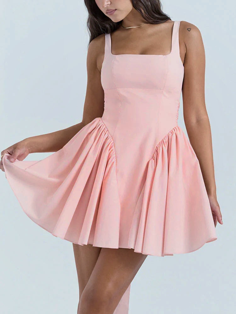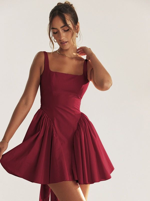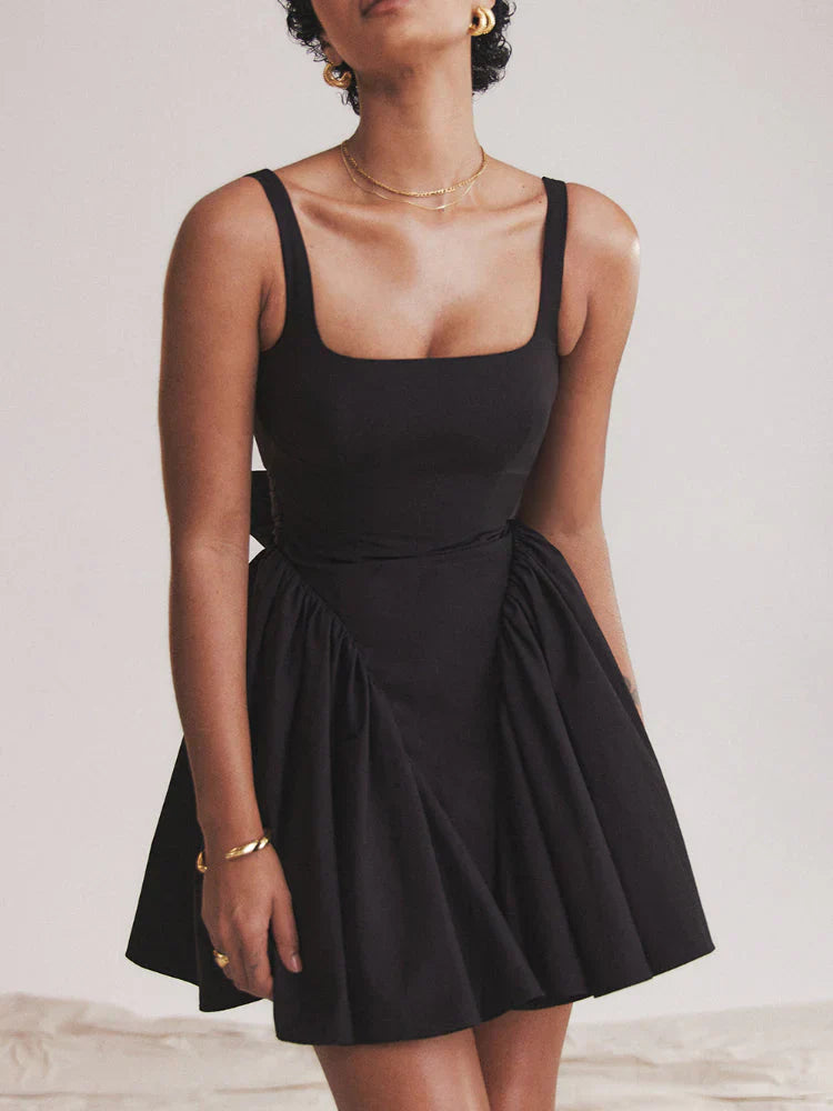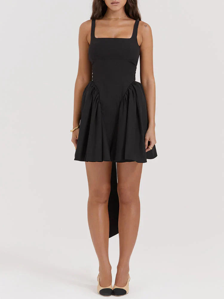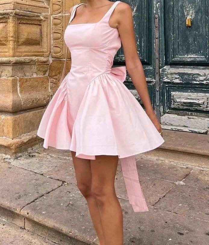 Μίνι φόρεμα με φιόγκο στην πλάτη σε άλφα princess γραμμή, μεσάτο που δένει πίσω με φιόγκο, υπέροχο μπούστο με cups που κολακεύουν το ντεκολτέ και ανοιχτή πλάτη πούτε κλείνει με φερμουάρ.