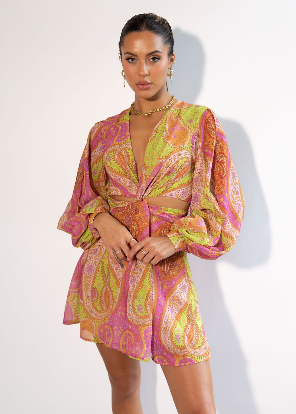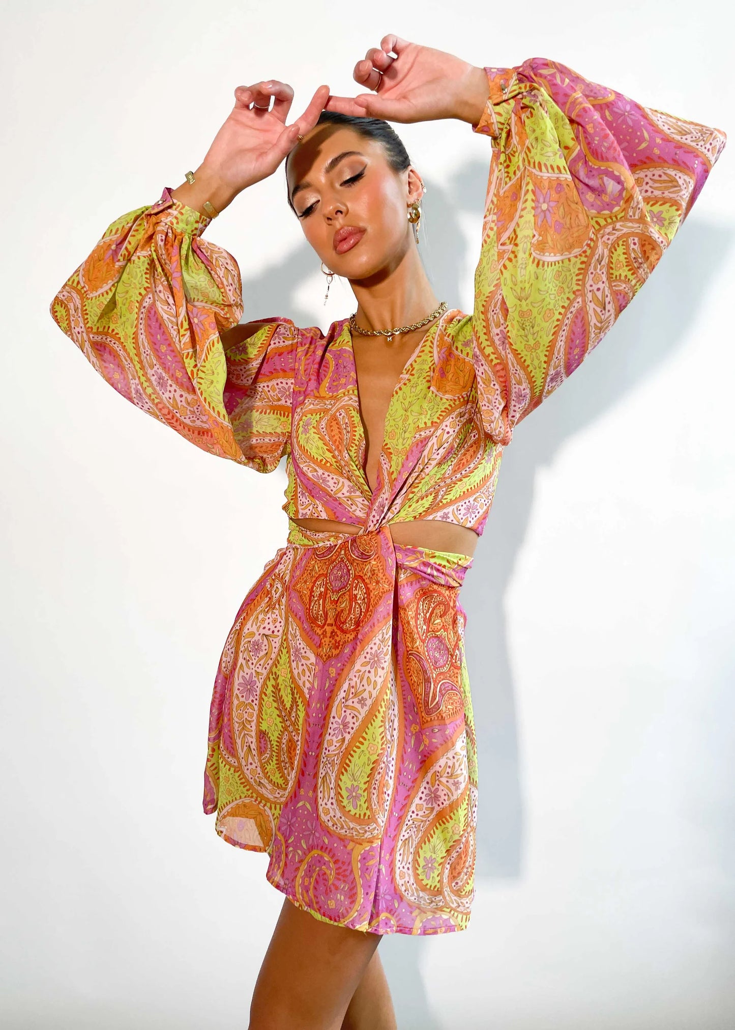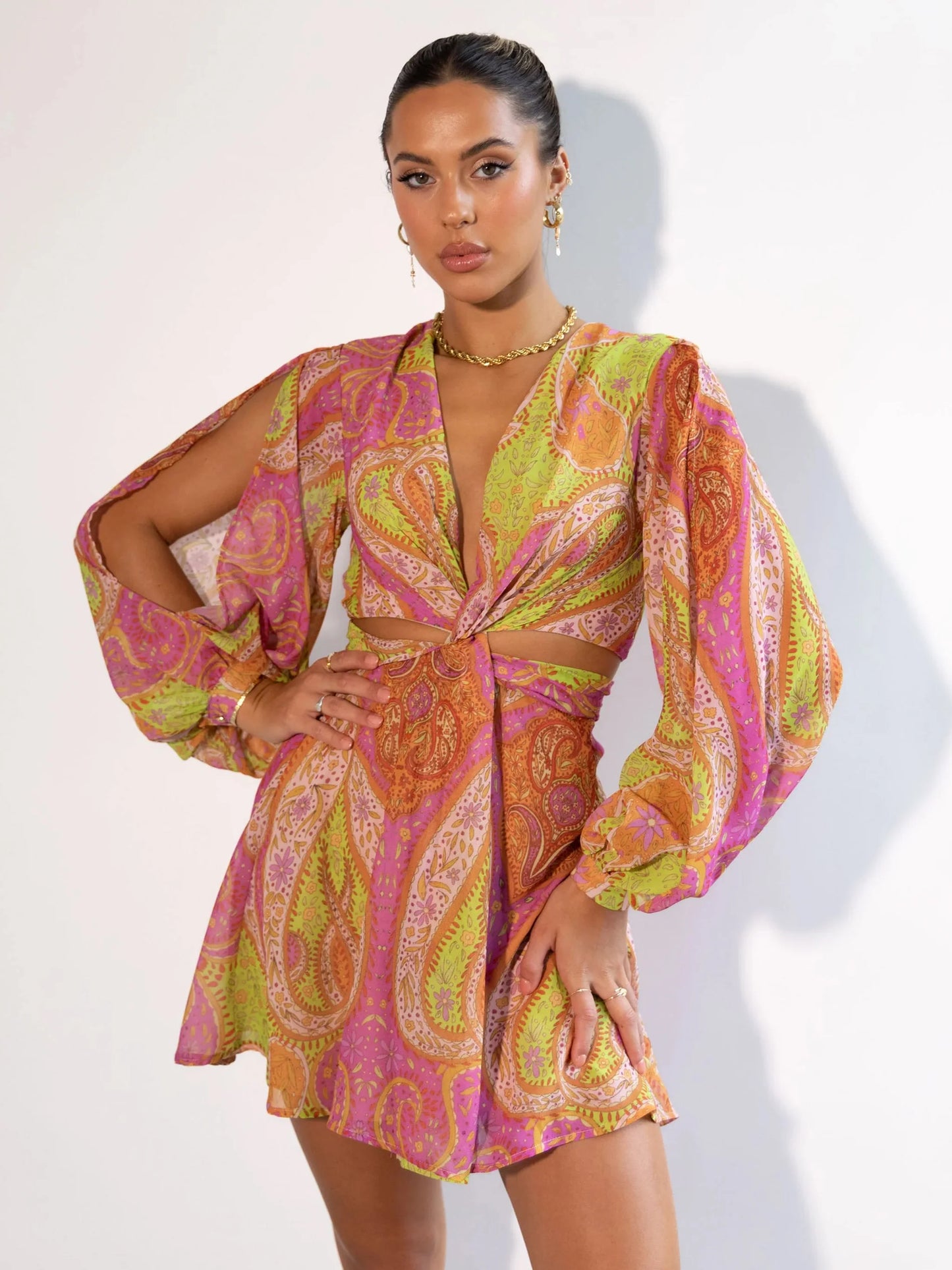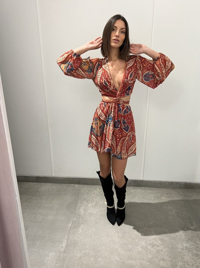 Φόρεμα μίνι με κοψίματα στη μέση και τα μανίκια για εντυπωσιακές εμφανίσεις.Boho print λαχούρια σε πανέμορφα εξωτικά χρώματα. Διαθέτει λάστιχο στη μέση και στα μανίκια.Ιδανικό μίνι φόρεμα για καλεσμένη σε βάφτιση ή γάμο.Κανονική εφαρμογή ένα μέγεθος που καλύπτει xs s m l xl και φοδραρισμένη αέρινο ύφασμα μουσελίνα.