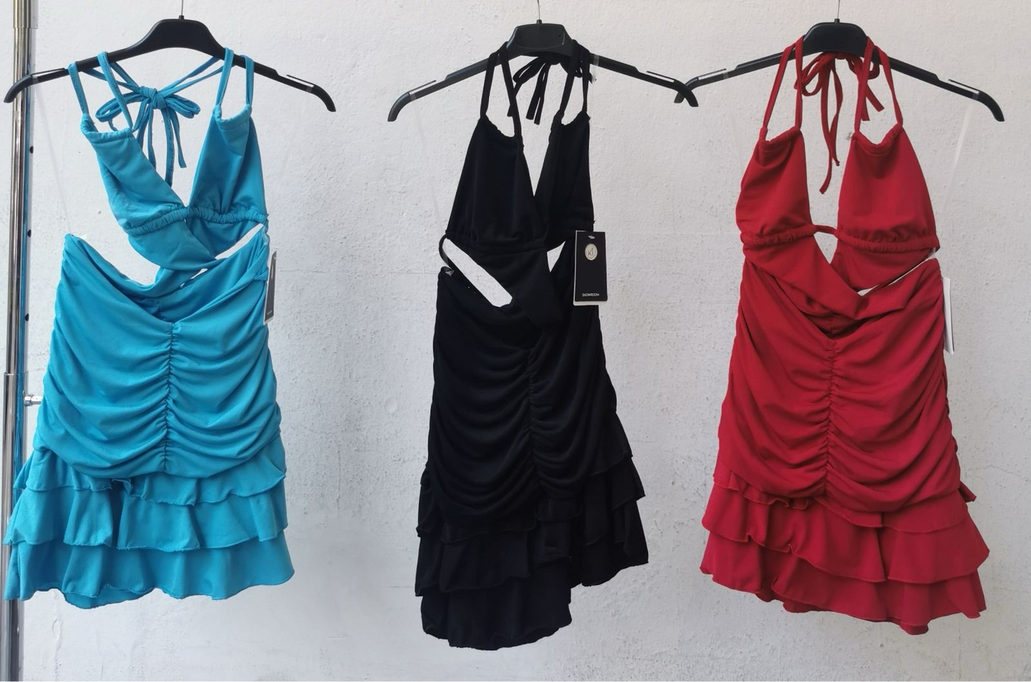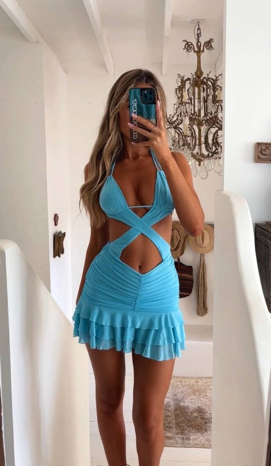 Σαγηνευτικό μινι φόρεμα με κοψίματα στο πανω μέρος σούρες στο στήθος που ρυθμίζονται με κορδονάκι και δένουν στο λαιμό και σούρες κι βολάν στο κάτω μέρος που κολακεύουν τις καμπύλες.