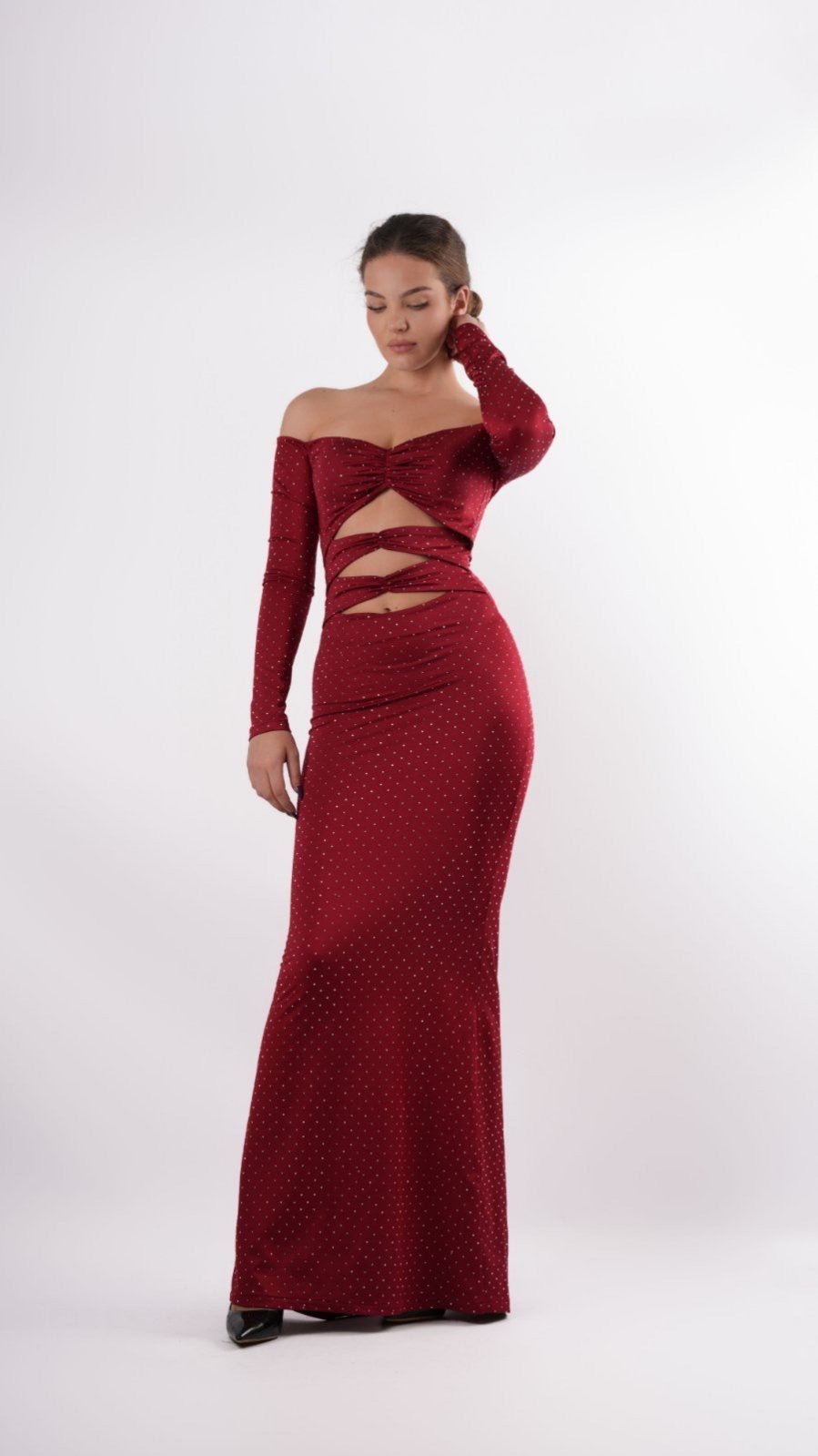 Μάξι μαύρο φόρεμα μακρυμάνικο με κοψίματα στην κοιλιά, ενίσχυση στο μπούστο κι υπέροχη λεπτομέρεια στρας σε όλο το μήκος του.