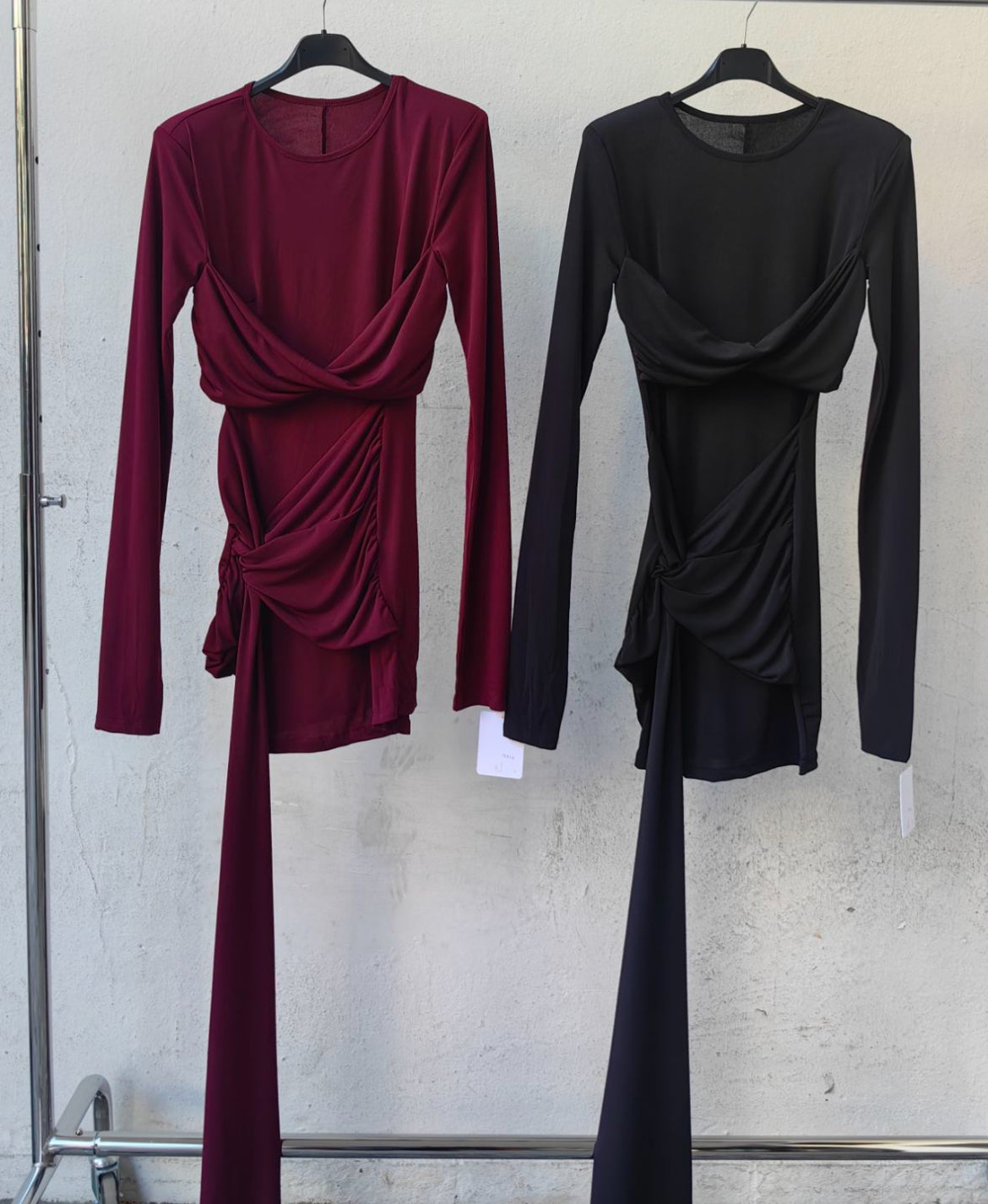Μακρυμάνικο μίνι φόρεμα με επιπλέον ύφασμα που κάνει δεσίματα και ουρά στο μπροστά μέρος.Ελαστικό ύφασμα.Διαθέσιμο σε μπορντό και μαύρο χρώμα.Ένα μέγεθος one size που καλύπτει μεγέθη s m l xl.