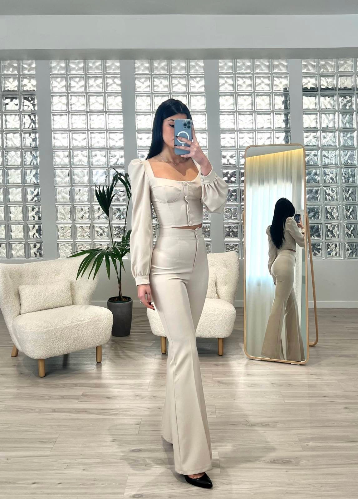 Μπεζ σετ, τοπ με φουσκωτά μανίκια και παντελόνι ψηλόμεσο