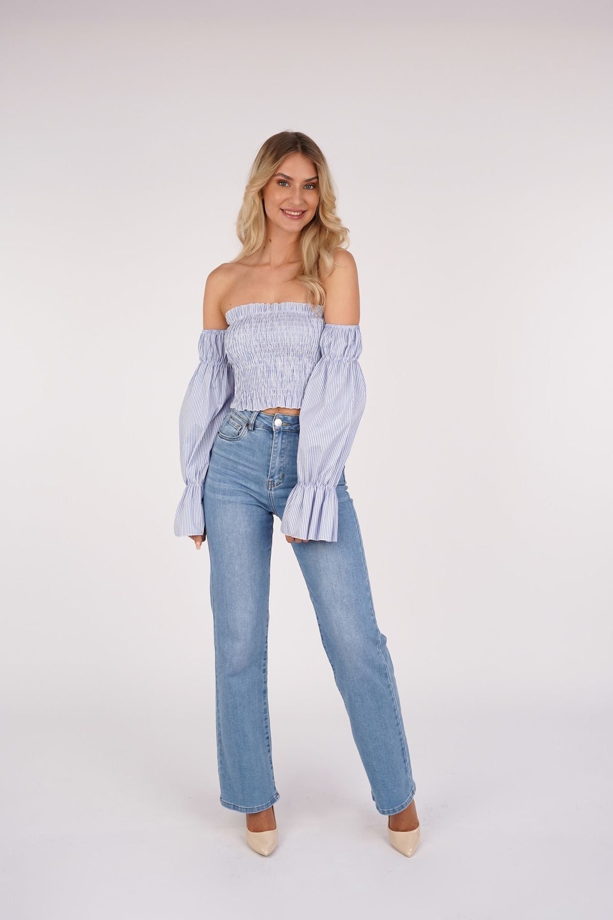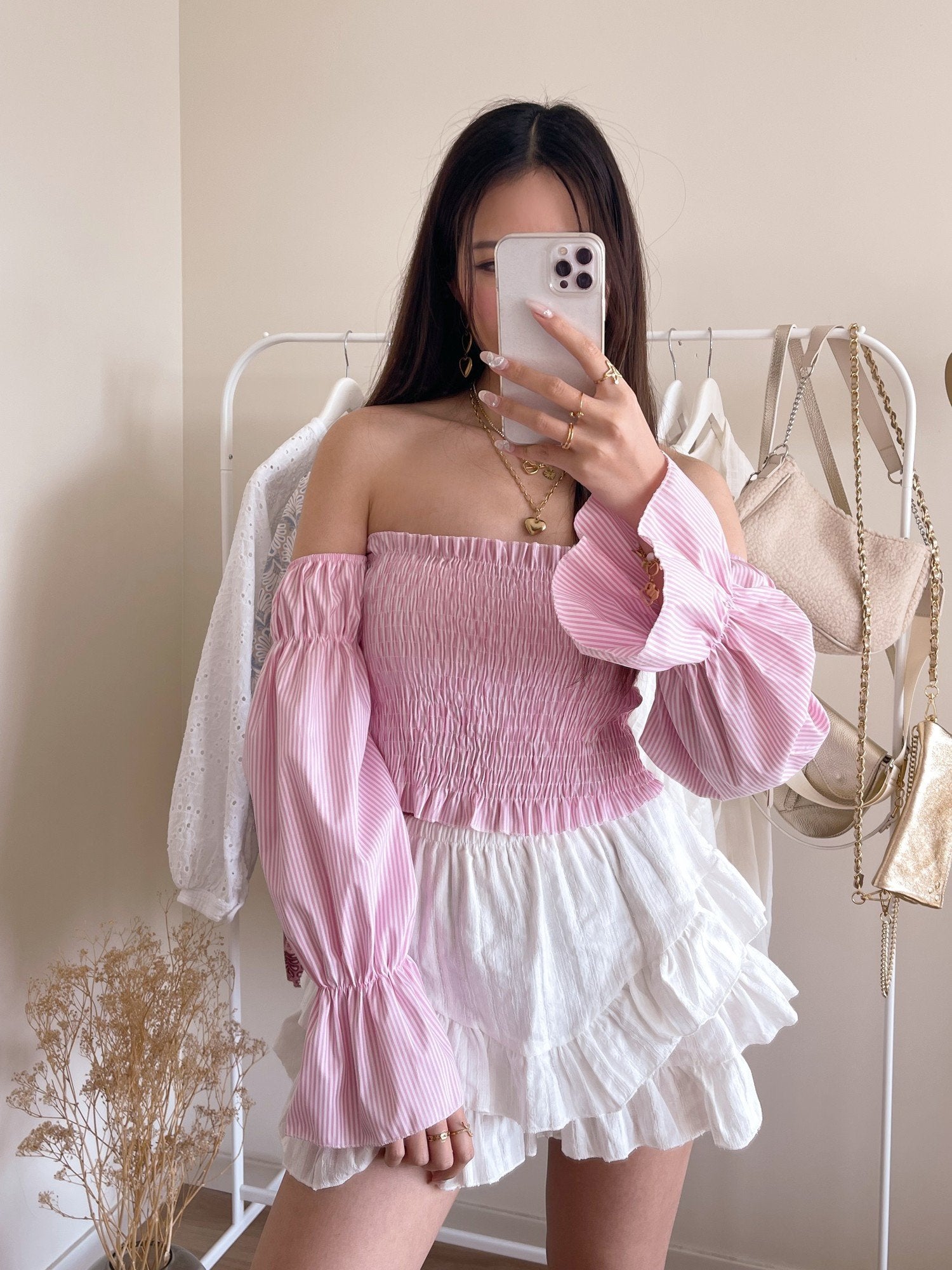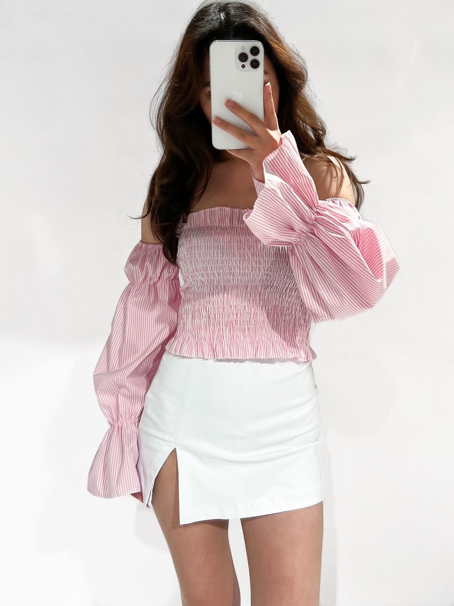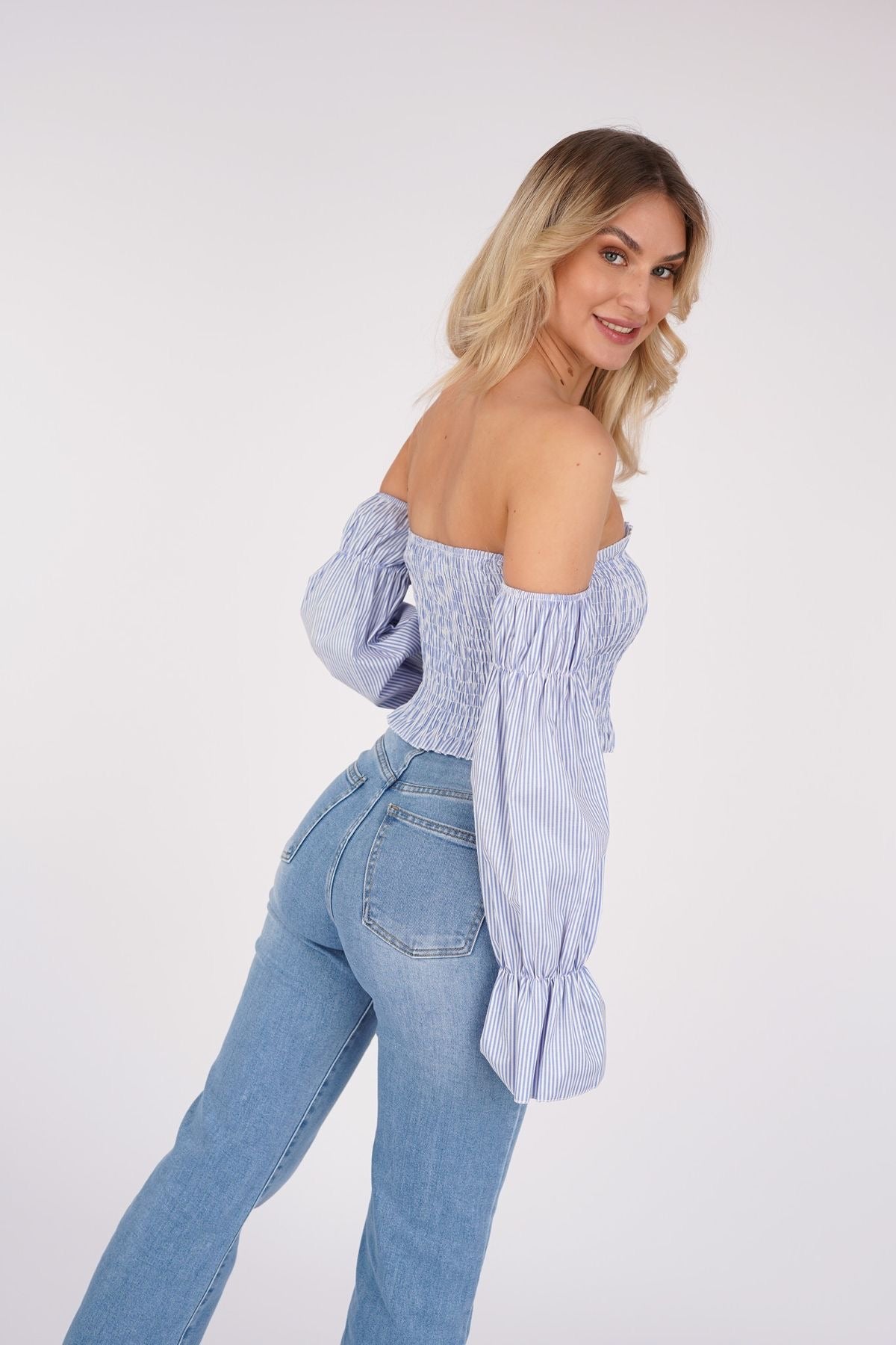 Τοπ σε στυλ ριγέ πουκάμισο με ελαστικό μπούστο σφηκοφωλιά και μακριά φουσκωτά μανίκια.Έξωμο με μεγάλη ελαστικότητα, ένα μέγεθος one size που καλύπτει xs s m l.Διαθεσιμο σε μαύρο γαλάζιο και ροζ
