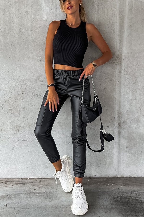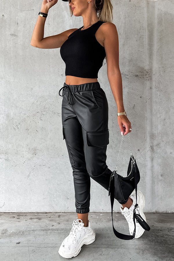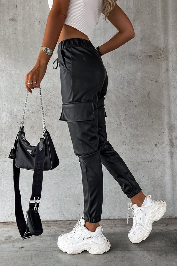 Cargo παντελόνι από οικολογική δερματίνη ψηλόμεσο με λάστιχο στη μέση και τσέπες.