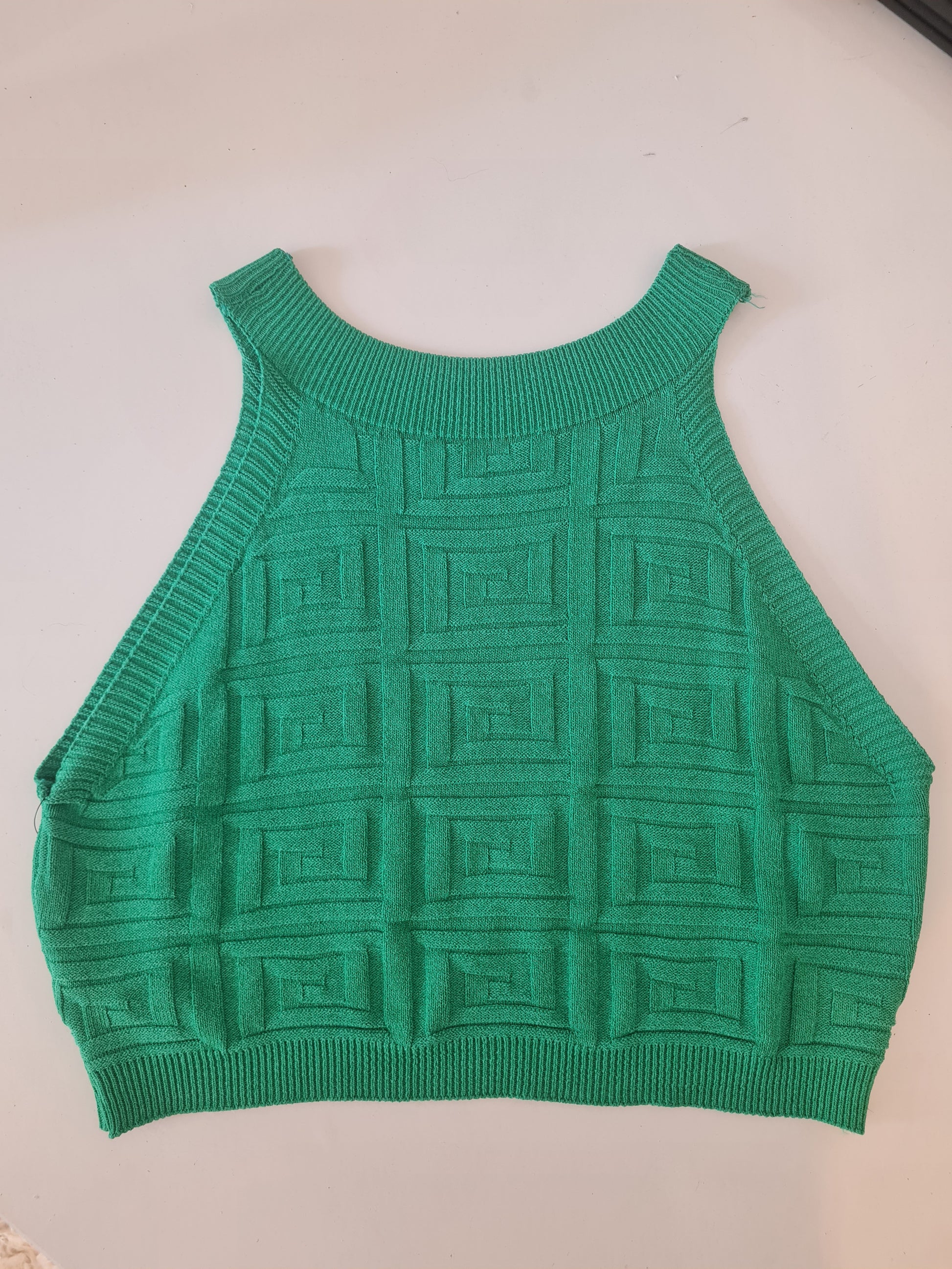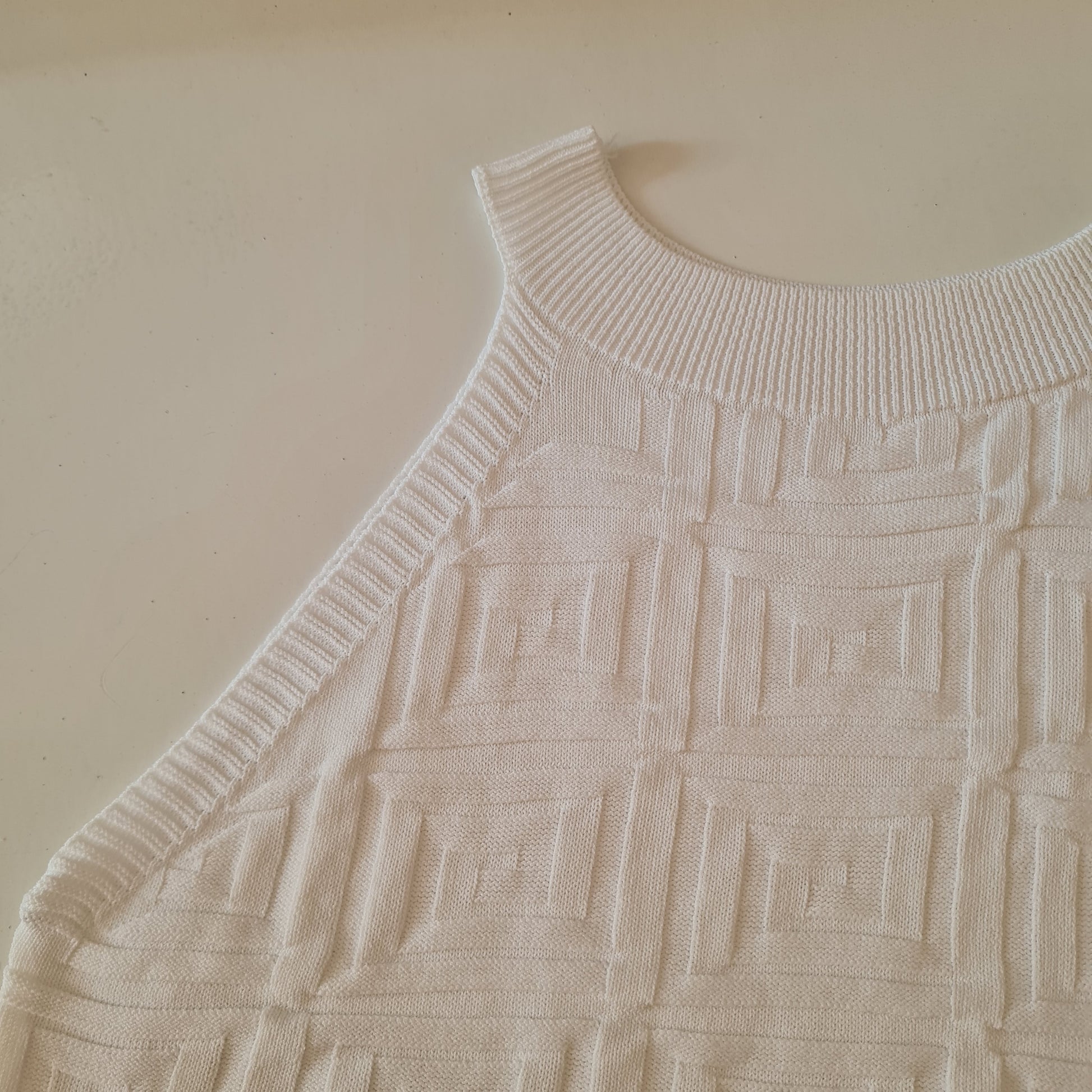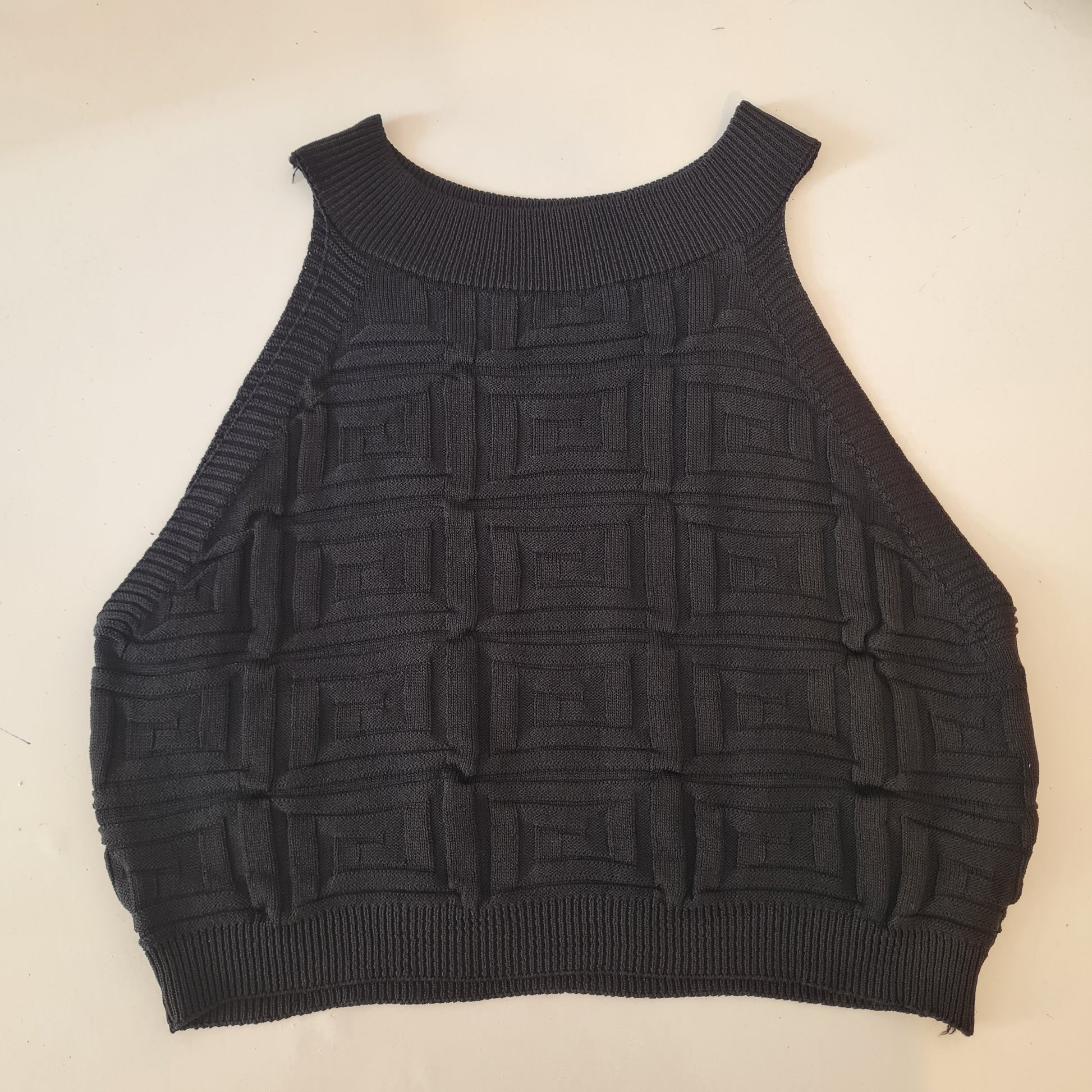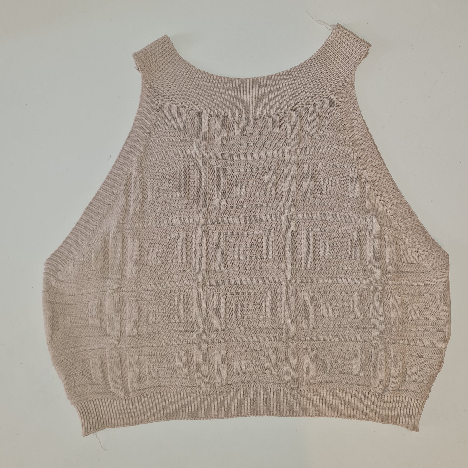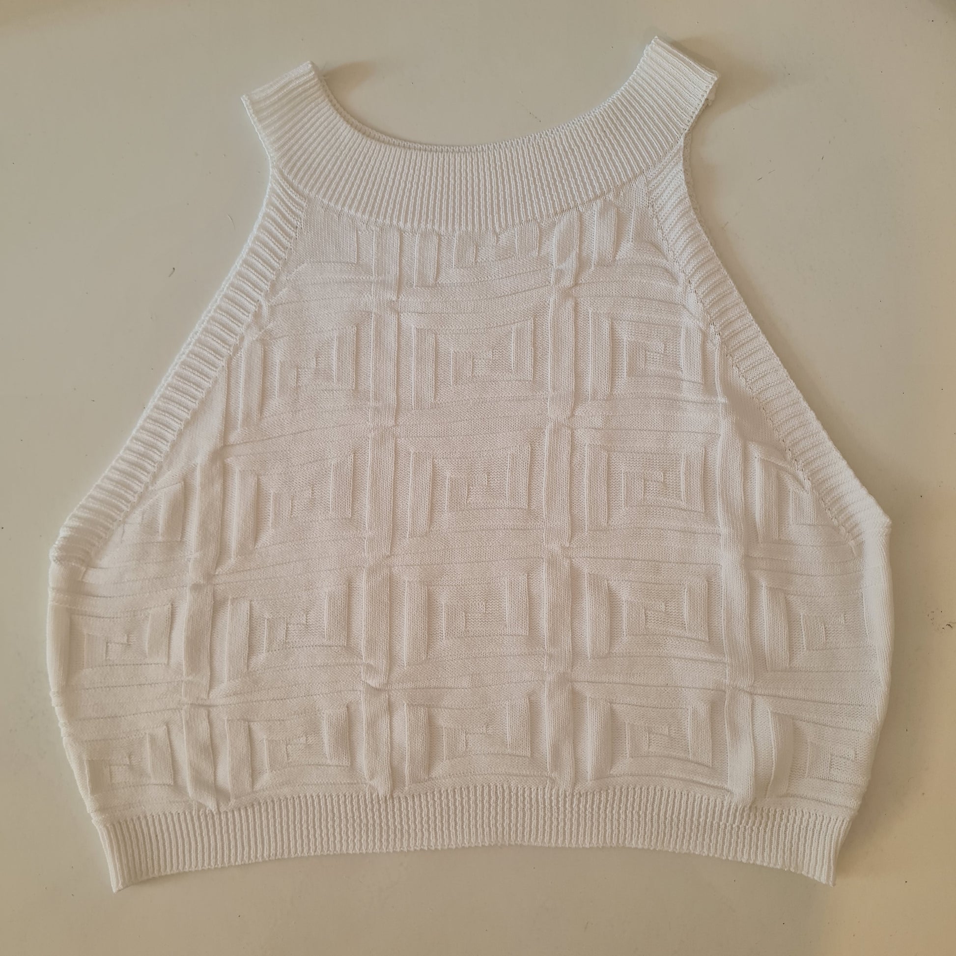 Ελαστικό τοπ πλεκτό με ανάγλυφα γεωμετρικά σχέδια με χοντρή πλέξη που δεν διαγράφει και δεν διαφανίζει.
