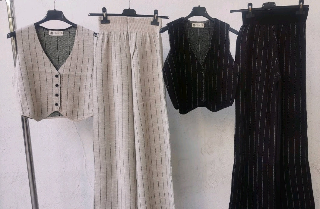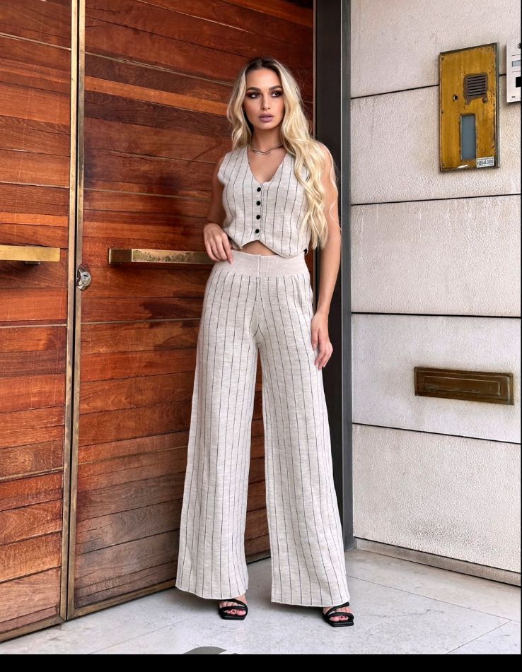 Ελαστικό πλεκτό σετ από μαλακό ύφασμα με ρίγες.Αποτελείται από αμάνικο γιλέκο με κουμπιά και παντελόνα άνετη σε ίσια γραμμή με λάστιχο στη μέση.