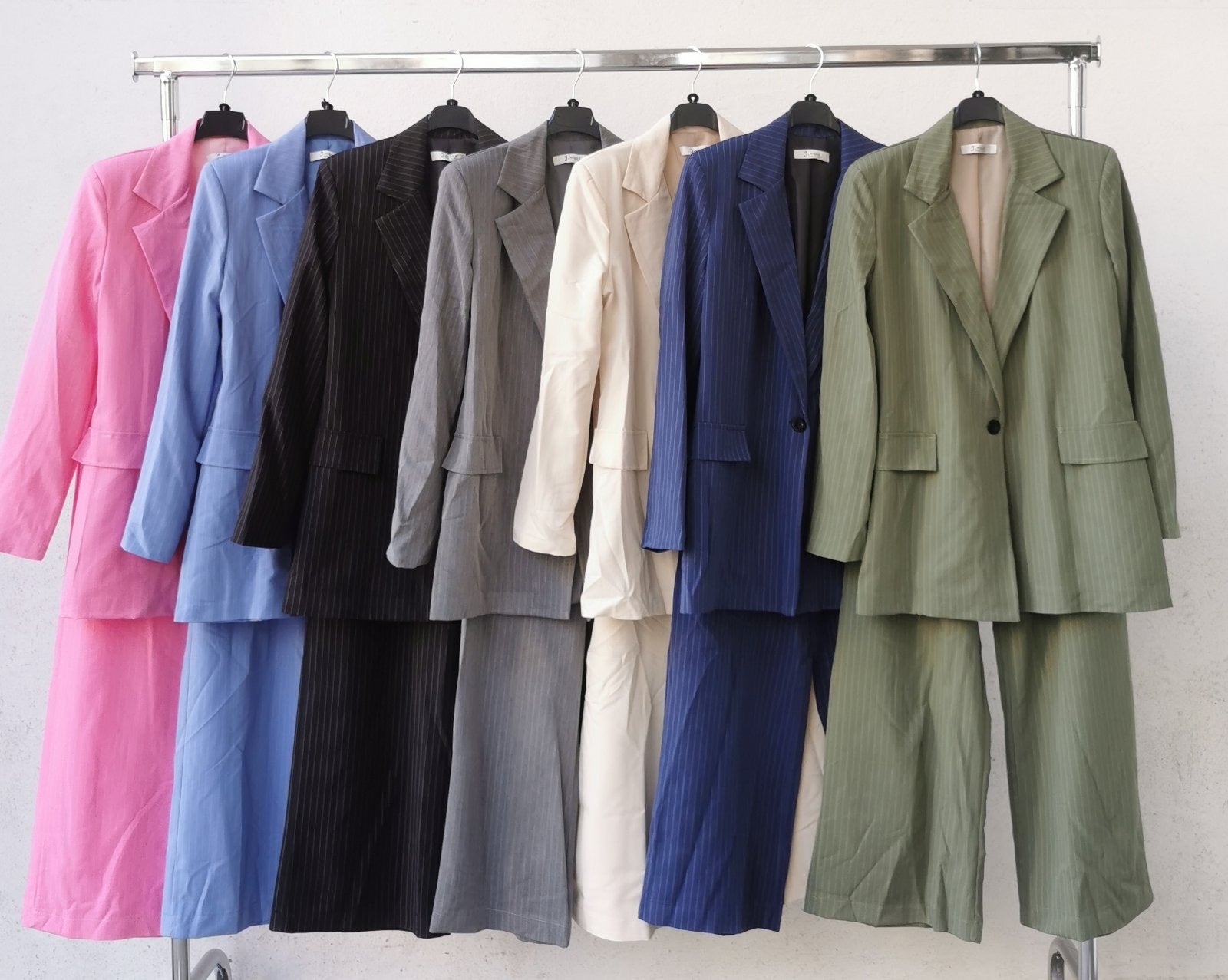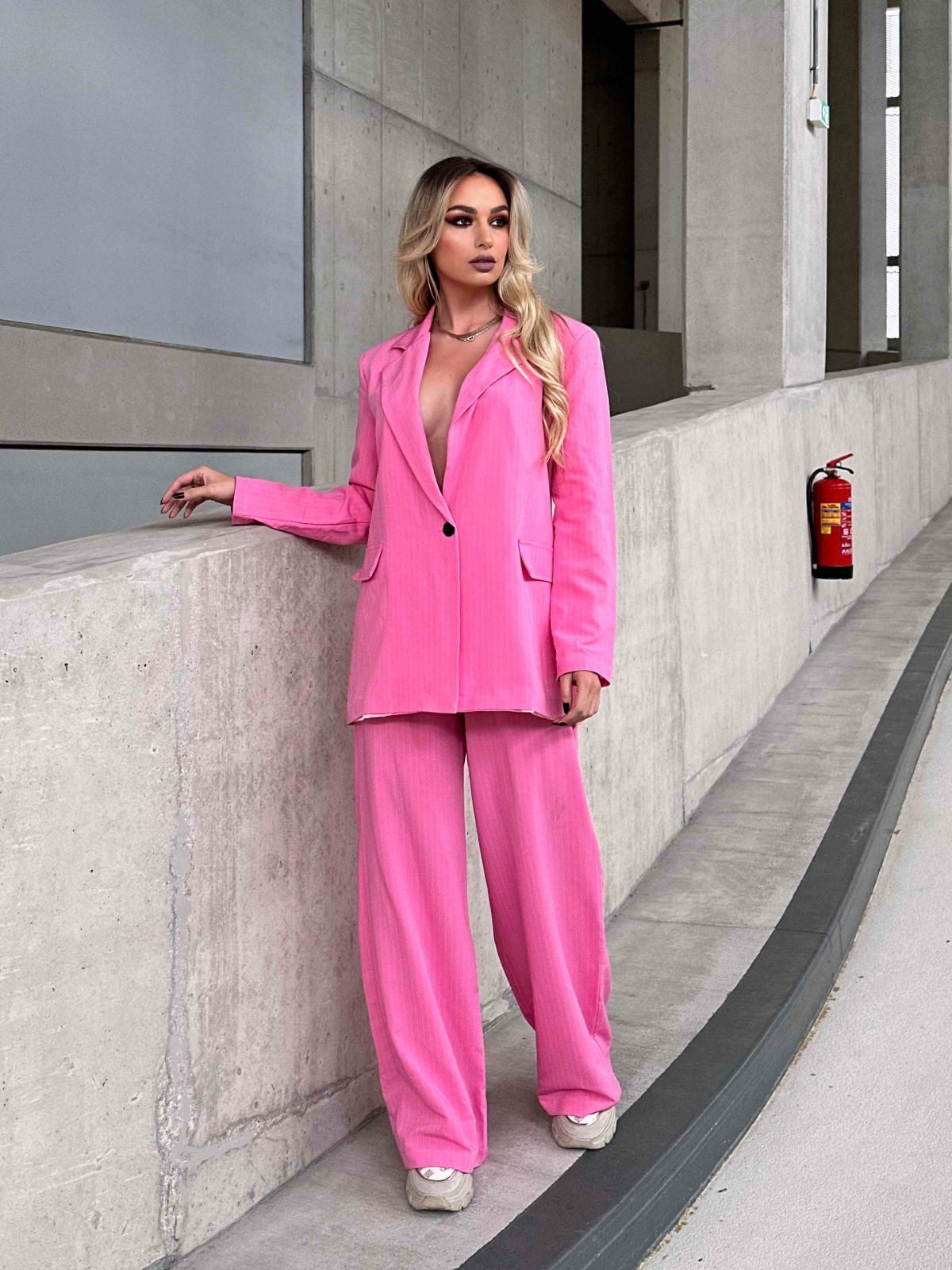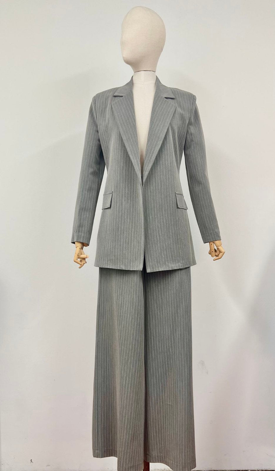 Κοστούμι ριγέ που αποτελείται από σακάκι ριγέ oversize με σατέν φόδρα και βάτες που κλείνει με κουμπί και παντελόνα ψηλόμεση με κουμπί και φερμουάρ, θιλάκια για ζώνη και λάστιχο στο πίσω μέρος της μέσης.