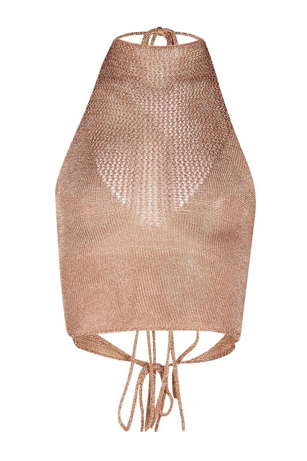 Ελαστικό τοπ πλεκτό με rose gold ασημοκλωστή που δένει με κορδόνια σε τρία σημεία,στο στον λαιμό και στην πλάτη.