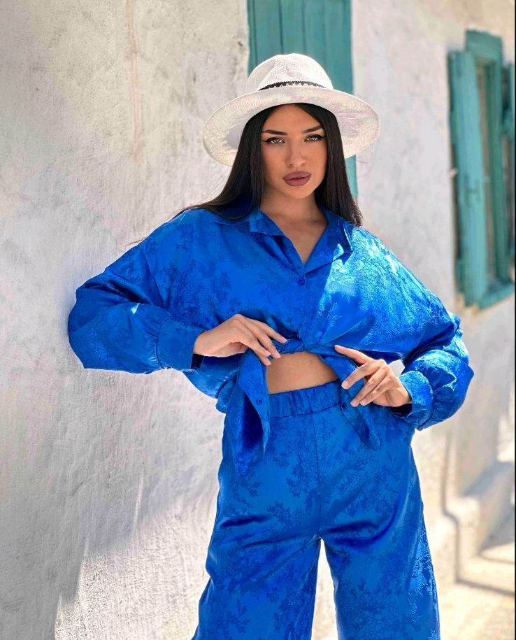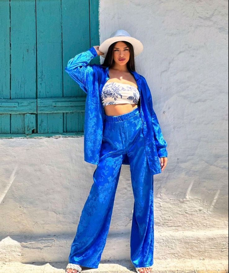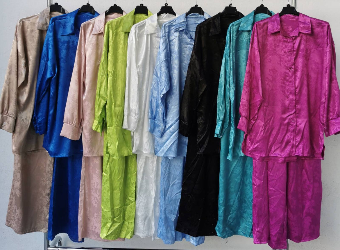Σατέν σετ με ανάγλυφα σχέδια σε διάφορα χρώματα που αποτελείται από πουκάμισο μακρυμάνικό που κλείνει με κουμπιά και καλύπτει την περιφέρεια σε άνετη γραμμή. Παντελόνι ψηλόμεσο με λάστιχο στη μέση σε άνετη γραμμή.Ένα μέγεθος oversize που καλύπτει μεγέθη xs-xl