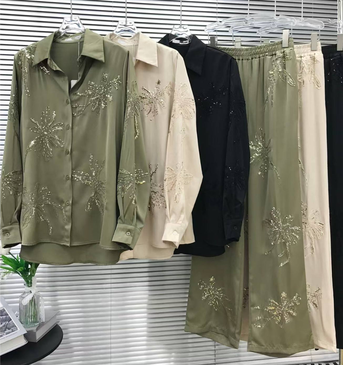 Σατέν σετ πουκάμισο και παντελόνι κεντημένο με παγιέτες.Ένα πολυτελές σετ για επίσημες περιστάσεις που θα λατρέψεις.Το σετ είναι oversized με άνετο πουκάμισο και λάστιχο στο παντελόνι.Ένα μέγεθος που καλύπτει μεγέθη xs s m l xl. Διαθέσιμο σε χακί μαύρο και μπεζ.