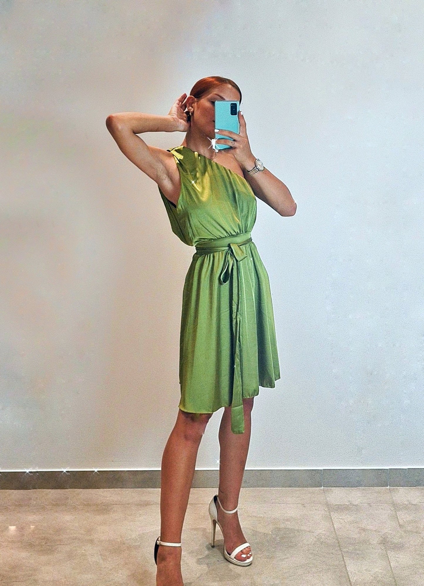 Σατέν φόρεμα μίνι με ζωνάκι που δένει στη μέση για να κάνει υπέροχη σιλουέτα.