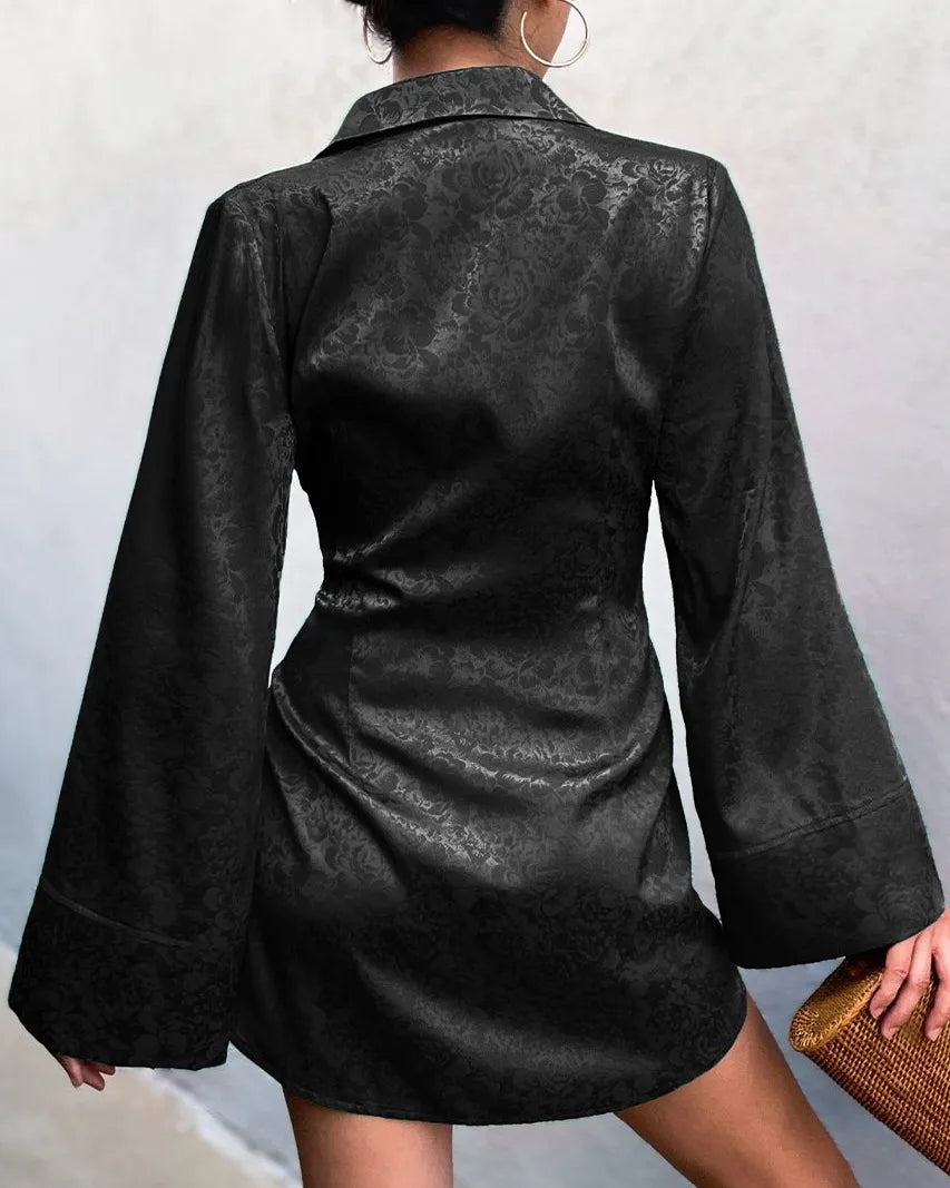 Σατέν φόρεμα πουκάμισο με ανάγλυφα σχέδια, κουμπάκια στο μπροστά μέρος και δέσιμο.Μανίκα καμπάνα.