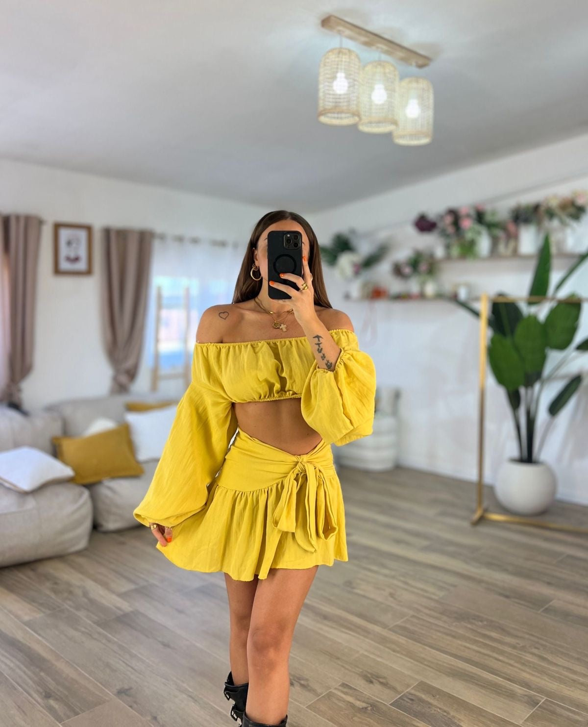 Πανέμορφο σετ με crop τοπ με φουσκωτά μανίκια και λάστιχο στα τελειώματα και φούστα ασσύμετρη δετή στο πλάϊ με βολάν.Στο πίσω μέρος η φούστα διαθέτει λάστιχο σφηκοφωλιά.Καταπληκτικό σετ που θα εντυπωσιάσει και θα χαρίσει στυλ στις βόλτες σου.