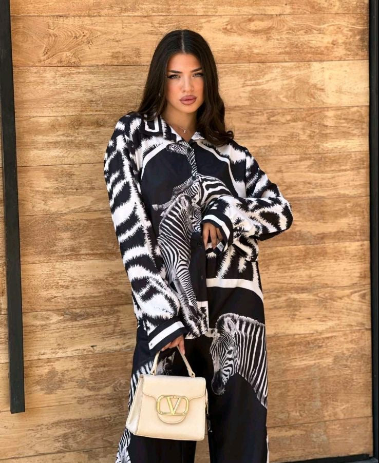 Γυναικείο σετ πουκάμισο με παντελόνα animal print και σχέδιο τίγρη. Το παντελόνι έχει λάστιχο στην μέση για να προσαρμόζει στο κάθε σώμα.