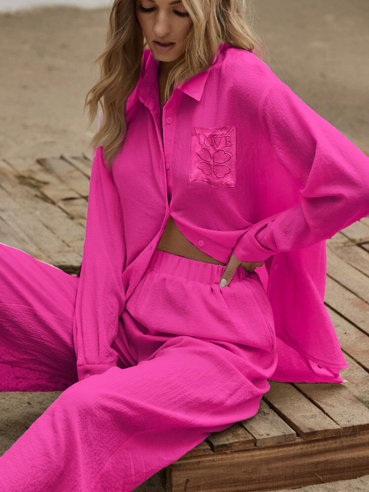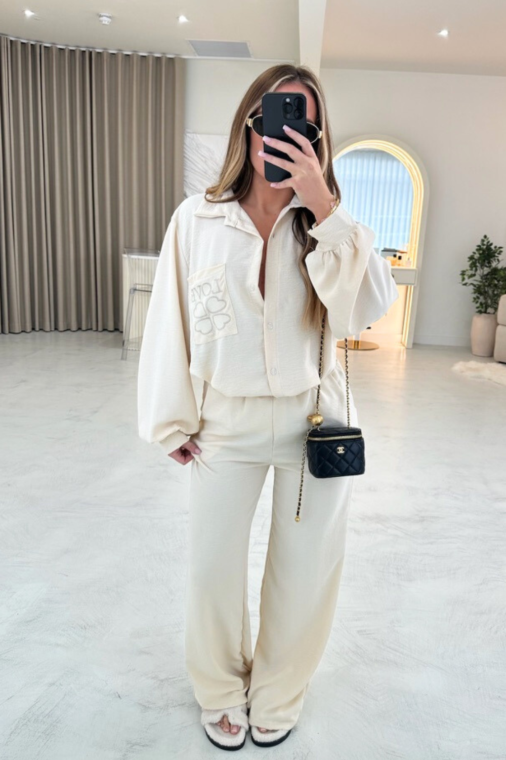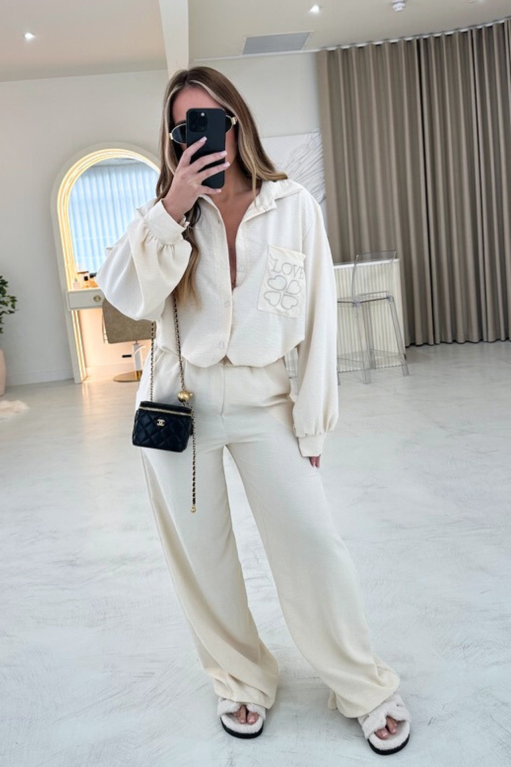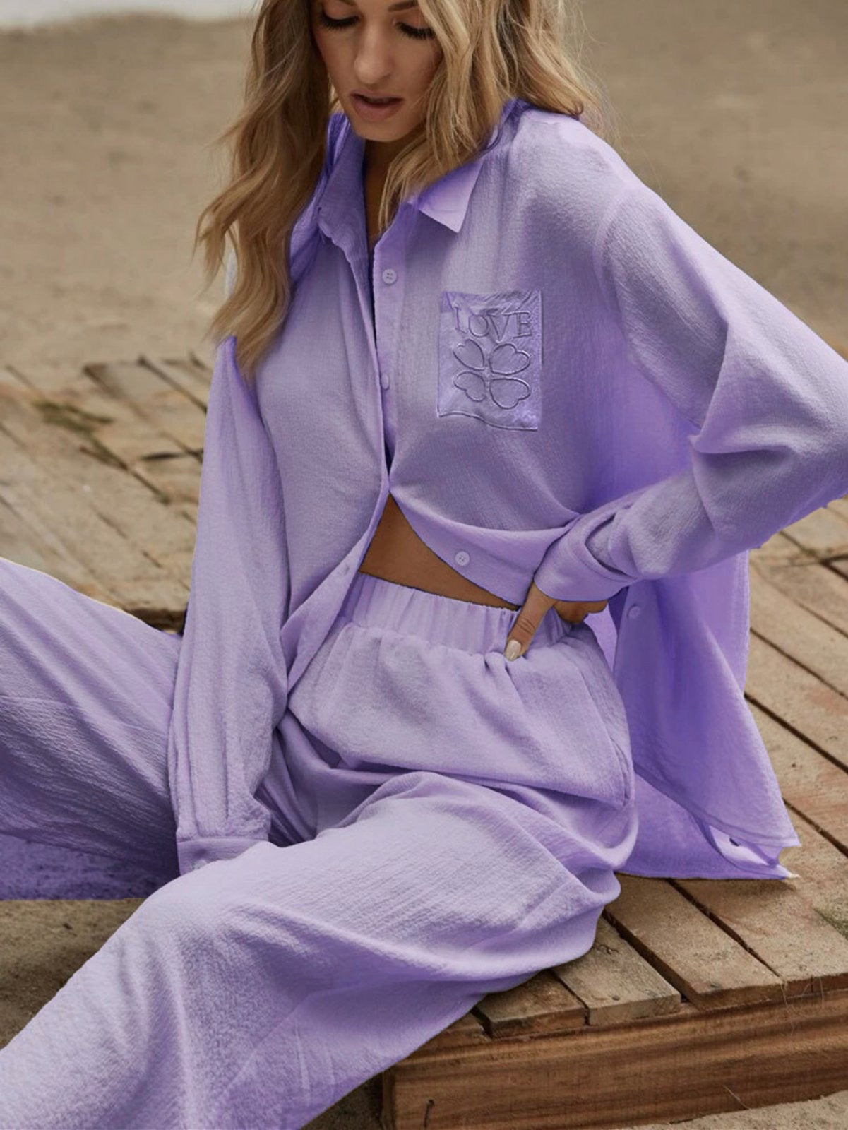 Άνετο σετ ανοιξιάτικο/καλοκαιρινό καθημερινό με πουκαμίσα oversize και παντελόνα ψηλόμεση σε άνετη γραμμή.