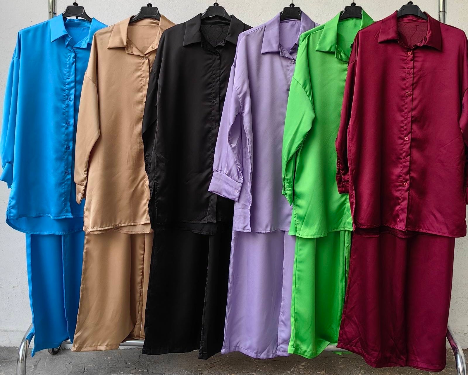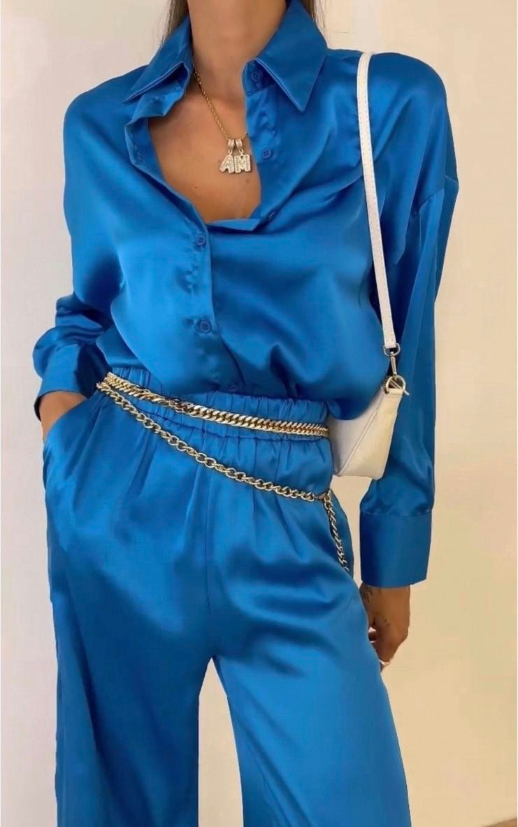 Σατέν σετ σε άνετη γραμμή με πουκάμισο oversized που κλείνει με κουμπάκια και παντελόνα άνετη με λάστιχο στη μέση σε ίσια γραμμή.
