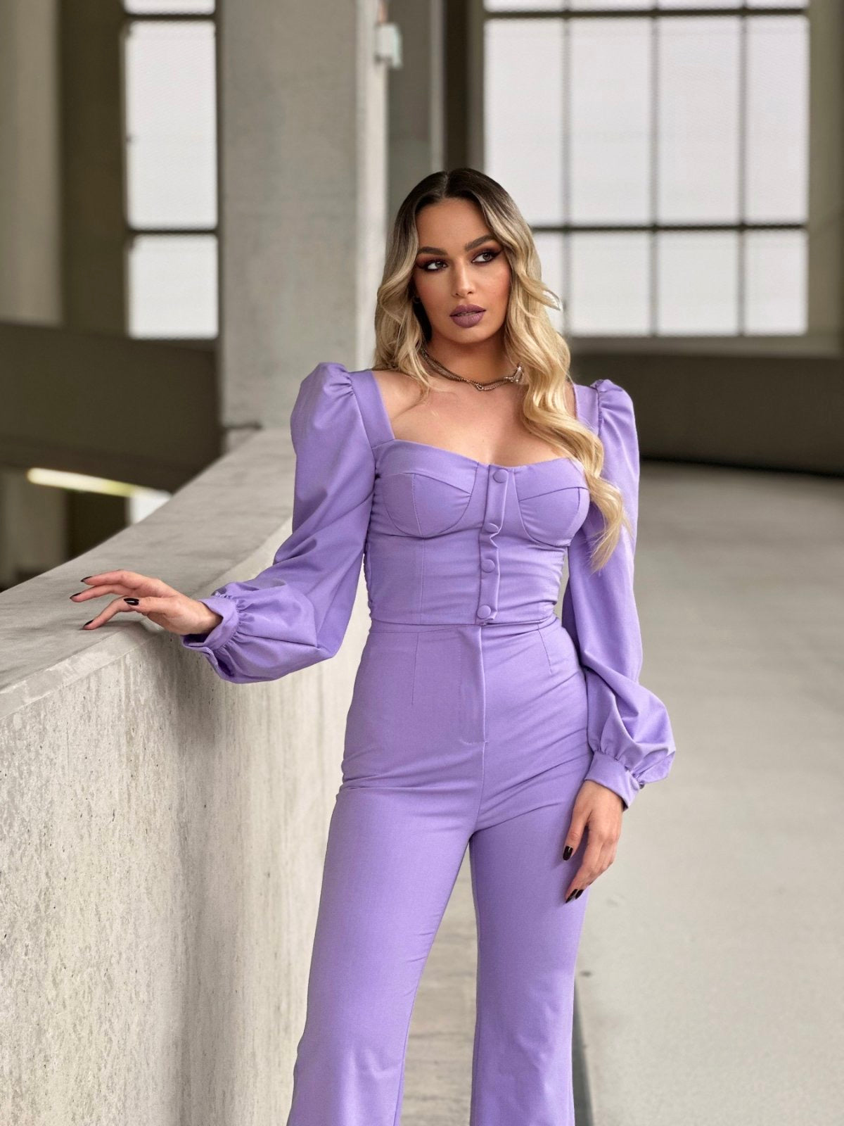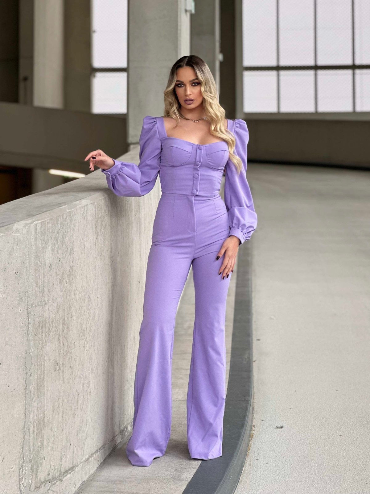 Σετ με μπλούζα με φουσκωτά μανίκια τύπου κορσέ που διαθέτει ενίσχυση στο στήθος και κουμπάκια μπροστά. Στο πίσω μέρος διαθέτει λάστιχο σφηγκοφωλιά. Το παντελόνι είναι ψηλόμεσο κλείνει με φερμουάρ και κουμπί και ανοίγει κάτω από το γόνατο. Σταθερό ύφασμα διαθέσιμο σε μεγέθη S M L. Διαθέσιμο σε χρώματα Μαύρο μπεζ λευκό σιέλ ροζ γκρι.