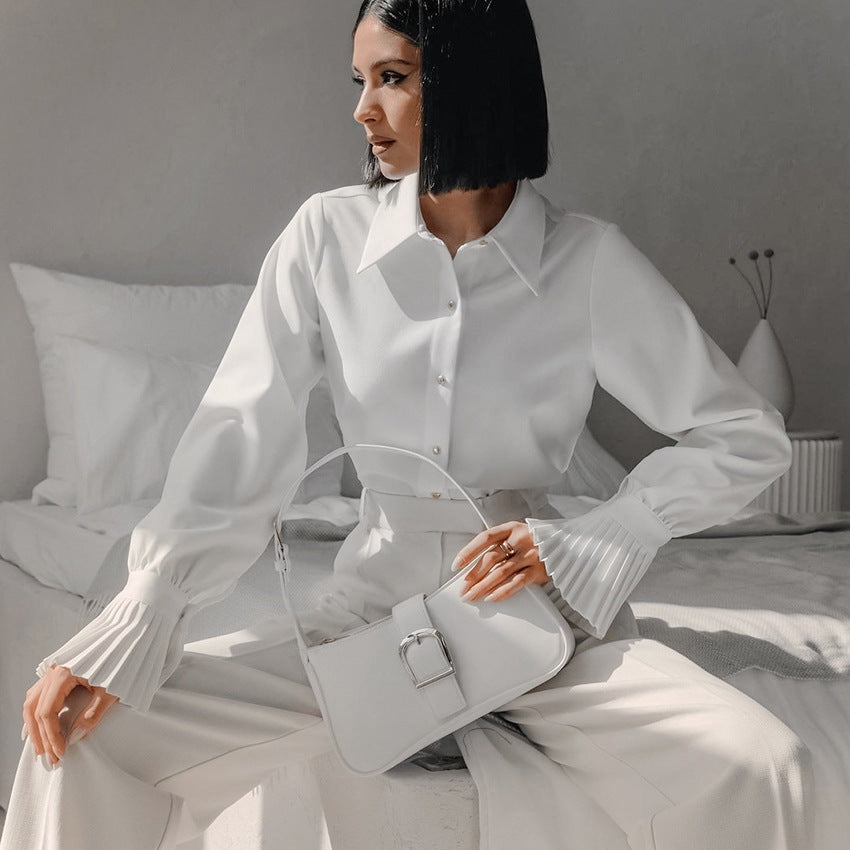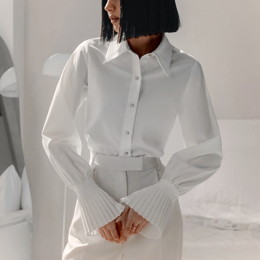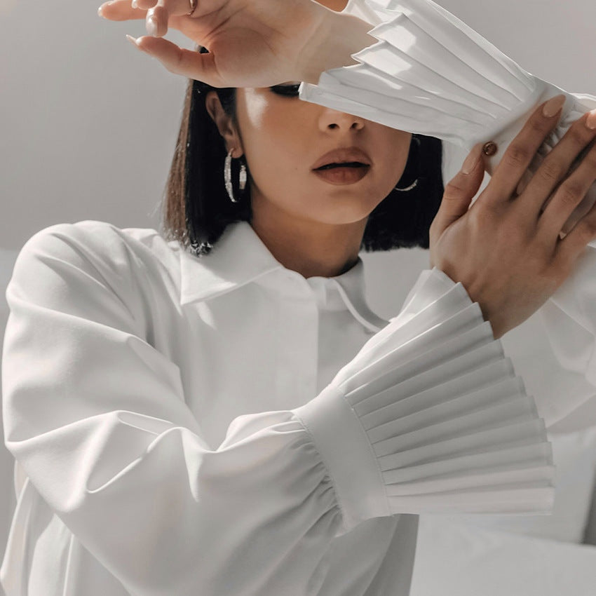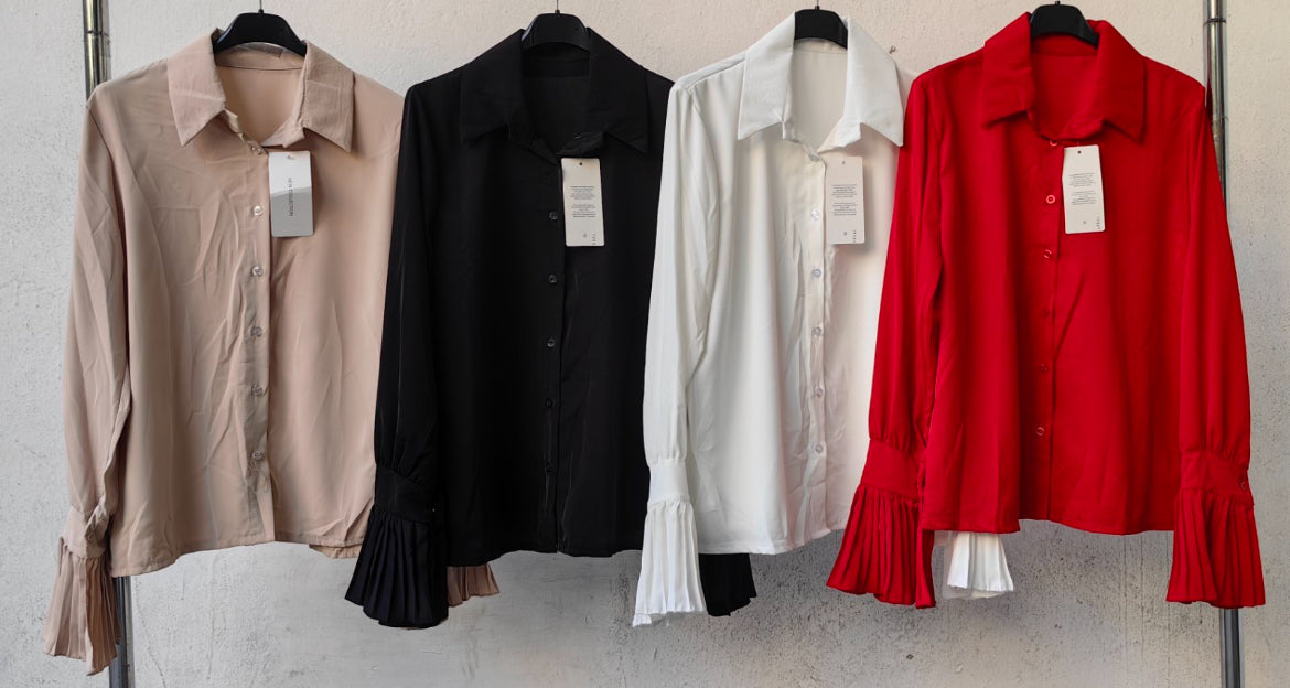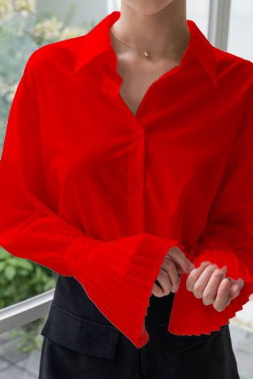 Πουκάμισο με πλισέ μανίκια απο σιφόν ύφασμα που δεν διαφανίζει με κουμπιά στο μπροστά μέρος και γιακά.Ιδιαίτερο σικ γυναικείο πουκάμισο απαραίτητο για το γραφείο η για την έξοδο σου.