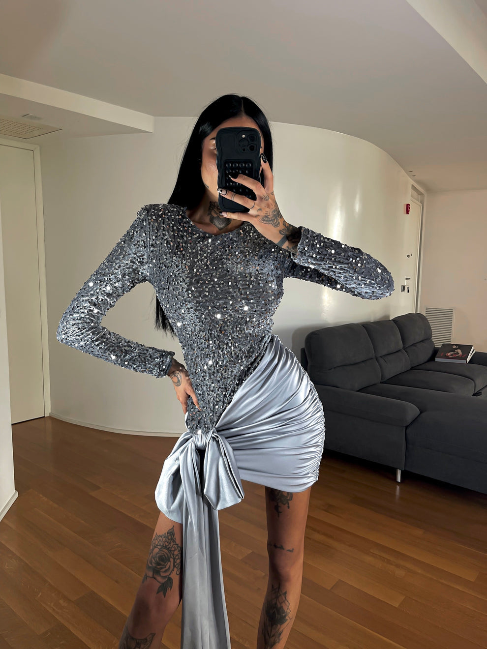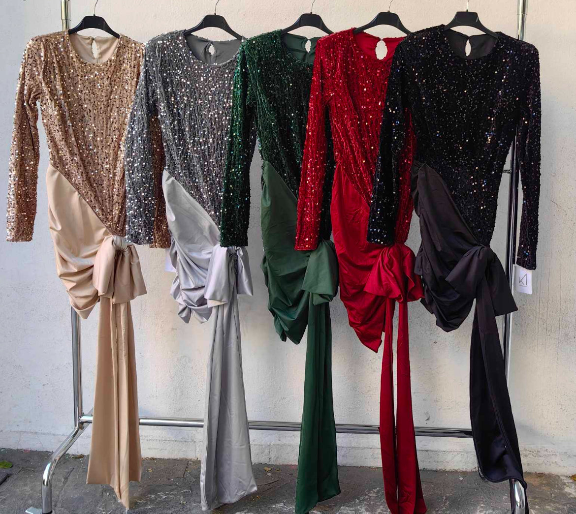 Μινι φόρεμα μακρυμάνικο με παγιέτες και φούστα απο σατέν ελαστικό ύφασμα με σούρες στο πίσω μέρος που δένει μπροστά σε μακρύ φιόγκο.Κλείνει με κουμπί πίσω απο το λαιμό, διαθέσιμο σε μέγεθος one size που καλύπτει μεγέθη xs s m l xl. Διαθέσιμο σε μαύρο, κόκκινο, γκρι, πράσινο, μπεζ.