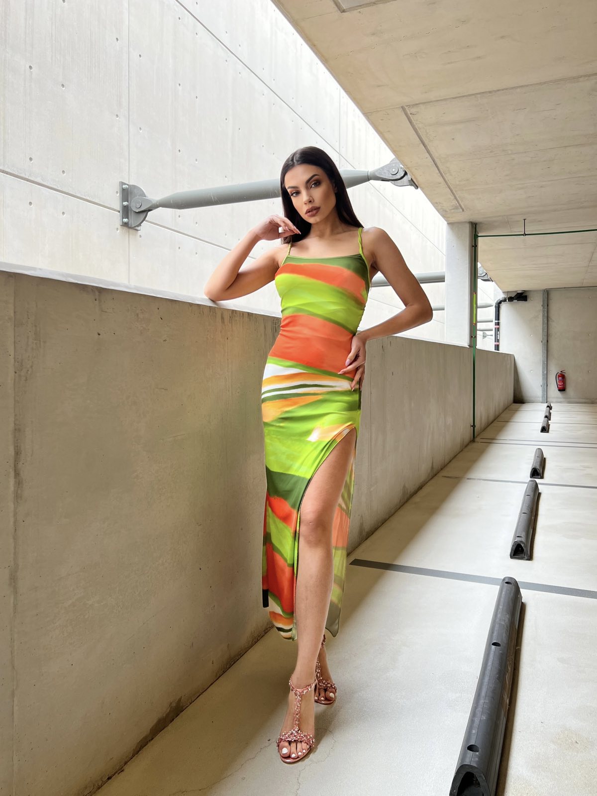 Φόρεμα εξώπλατο με print tie dye.Ειναι ελαστικό με ανοιχτή πλάτη που δένει με κορδόνια και ρυθμίζεται.Με ενίσχυση cups στο στήθος για εξτρα στήριξη.Διαθέτει σκίσιμο στο πλάι.Καλύπτει μεγέθη xs s m l xl.