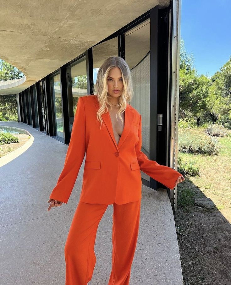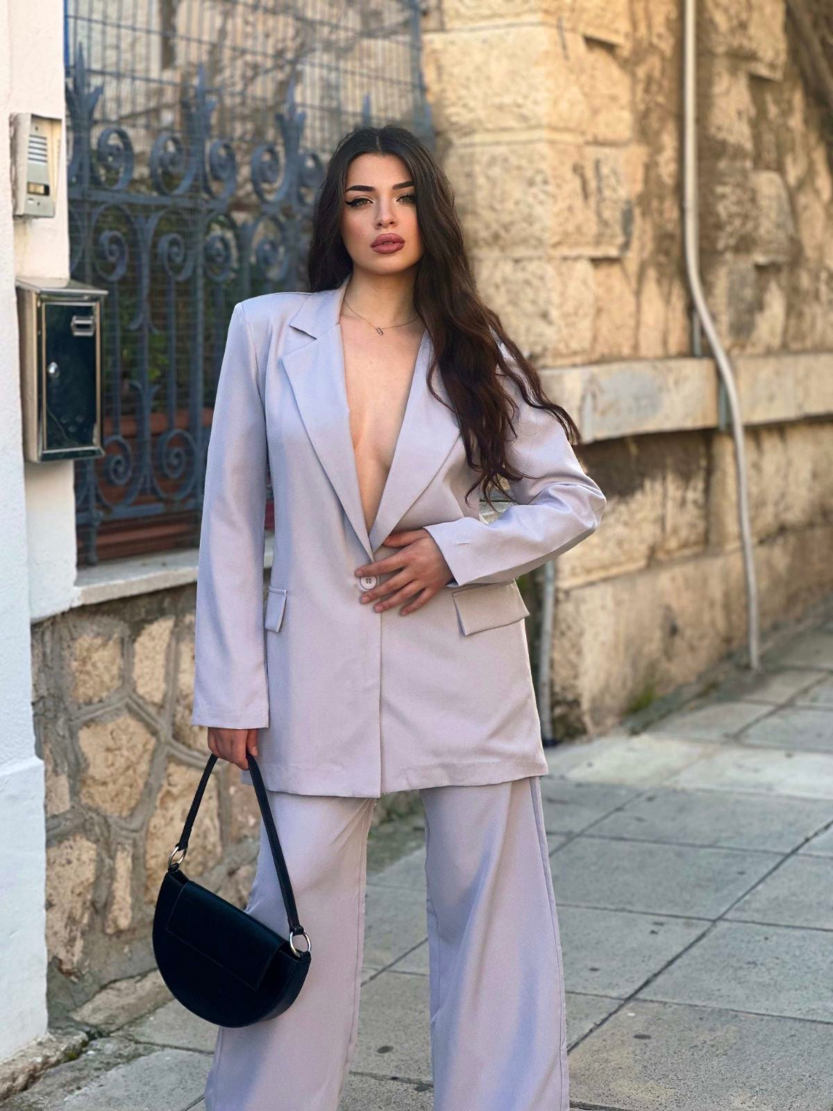 Μπεζ σετ κοστούμι με σακάκι σε άνετη oversized γραμμή που διαθέτει σατέν φόδρα, διακοσμητικές τσέπες και κουμπί.Διαθέτει βάτες.