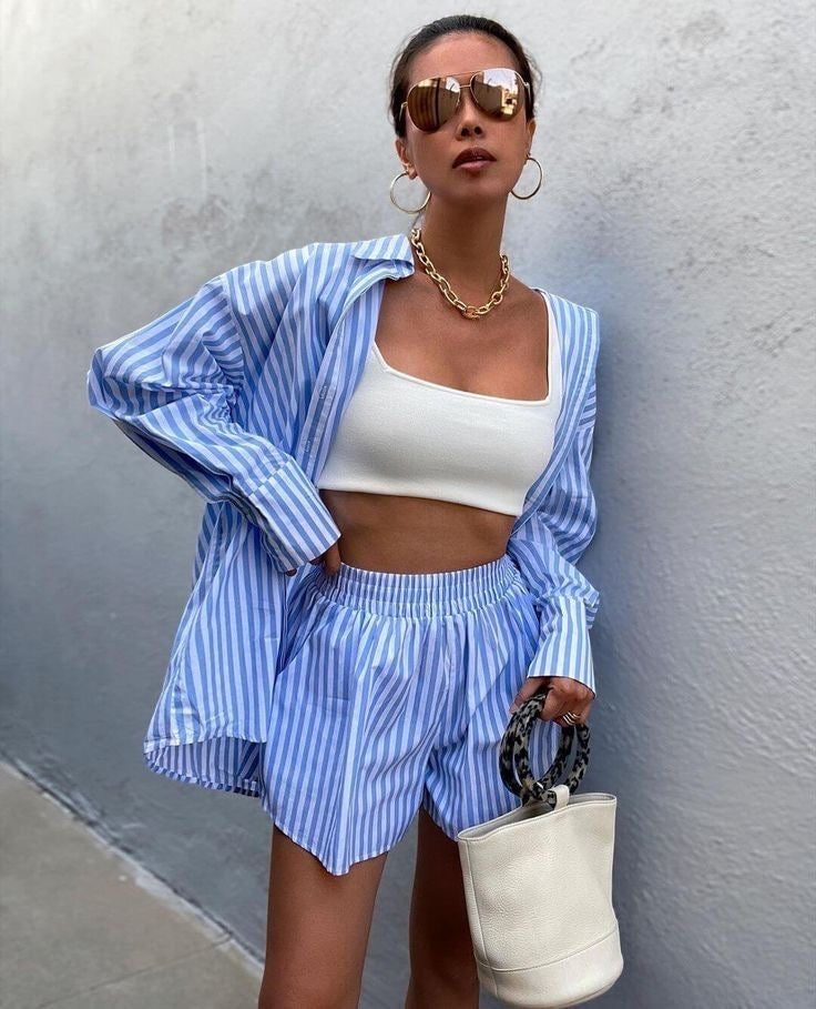 Ριγέ γυναικείο πουκάμισο oversized σετ με ριγέ σορτσάκι oversized ψηλόμεσο με λάστιχο στη μέση.Το πουκάμισο κλείνει με κουμπιά και διαθέτει τσέπη.Διαθέσιμο σε ριγέ γαλάζιο, ροζ, μαύρο και λιλά.