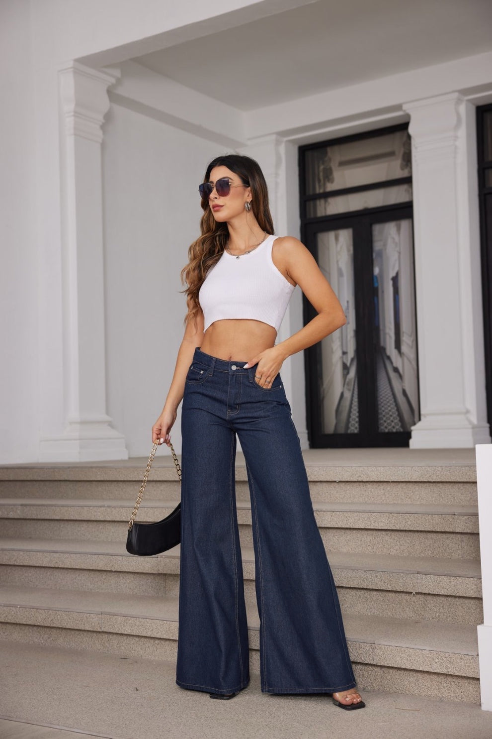 Τζιν παντελόνι φαρδιά καμπάνα mid waist, κανονική εφαρμογή.Κλείνει με κουμπί και φερμουάρ.Διαθέσιμη με μεγέθη xs s m l xl και σε σκούρο μπλε, ανοιχτό γαλάζιο, λευκό, γκρι και μαύρο.