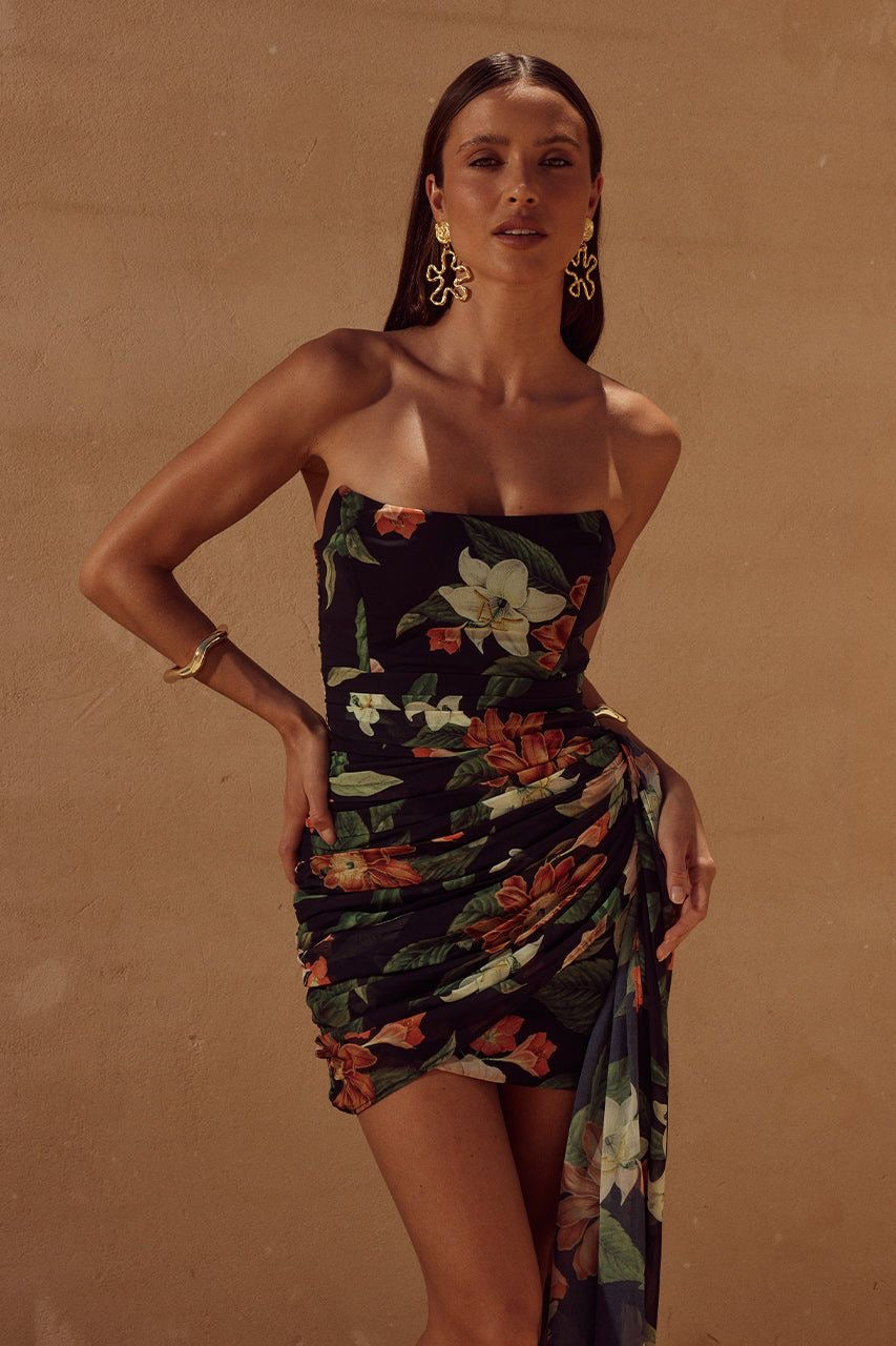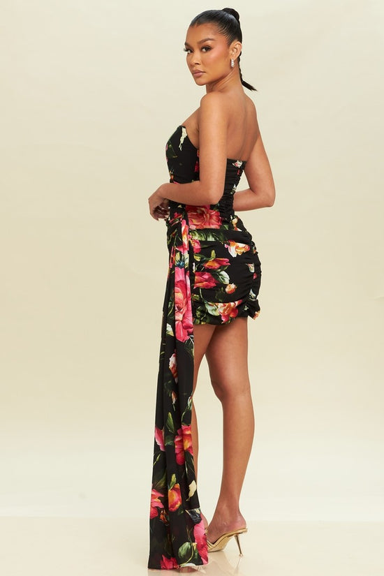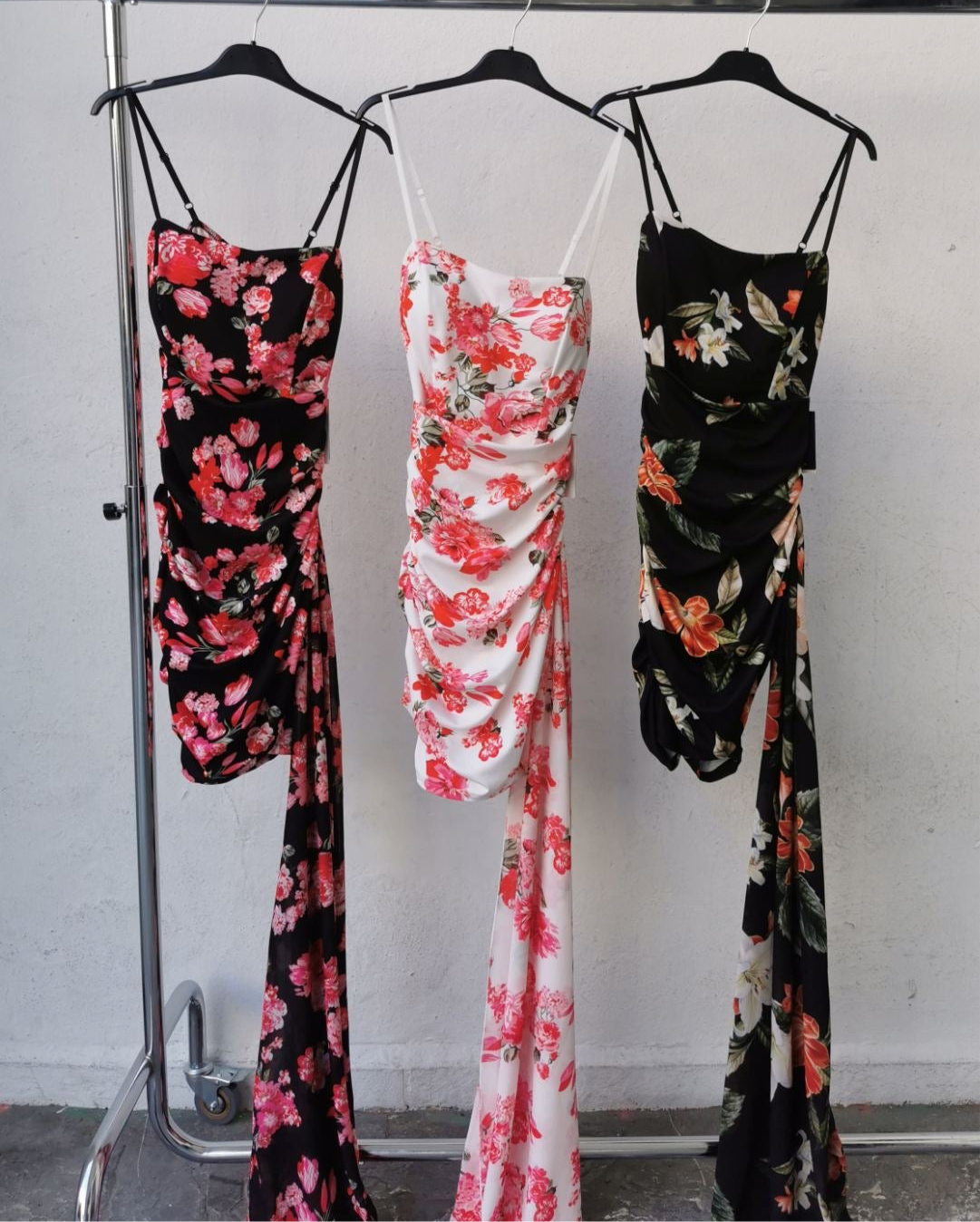 Καταπληκτικό φλοράλ φόρεμα,μίνι απο ελαστικό ύφασμα με σούρες στο κάτω μέρος και μακρύ ύφασμα βολάν στο πλάι.Διαθέτει αυξωμειώμενες τιράντες. Ιδανικό για ένα παιχνιδιάρικο και σαγηνευτικό look καλεσμένης σε γάμο.