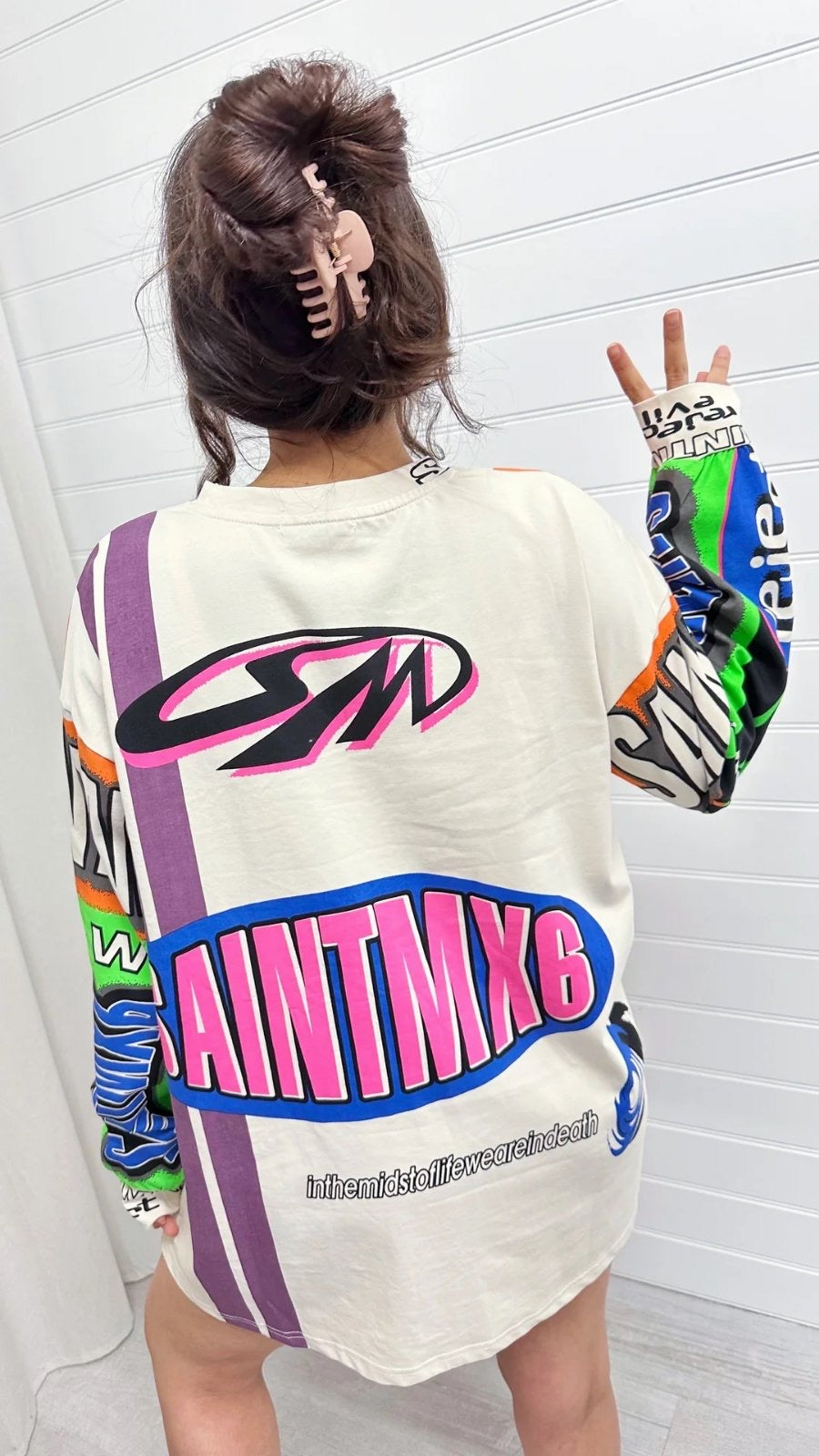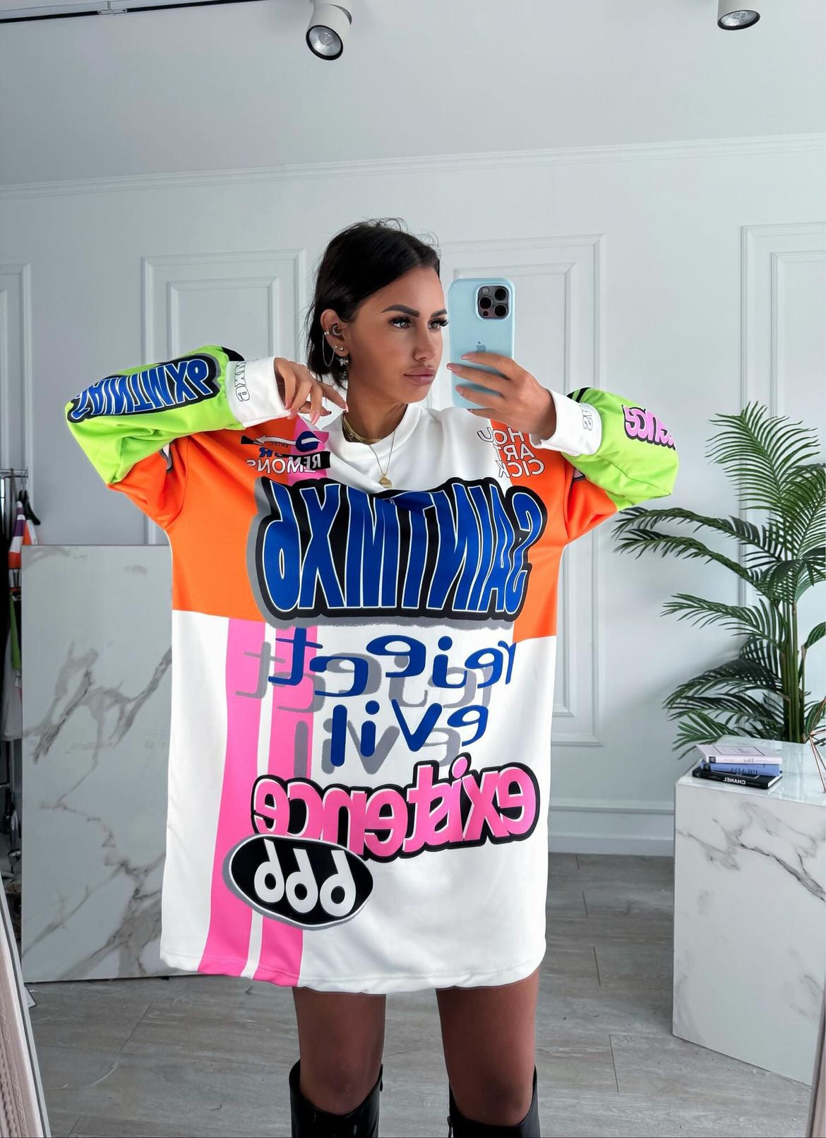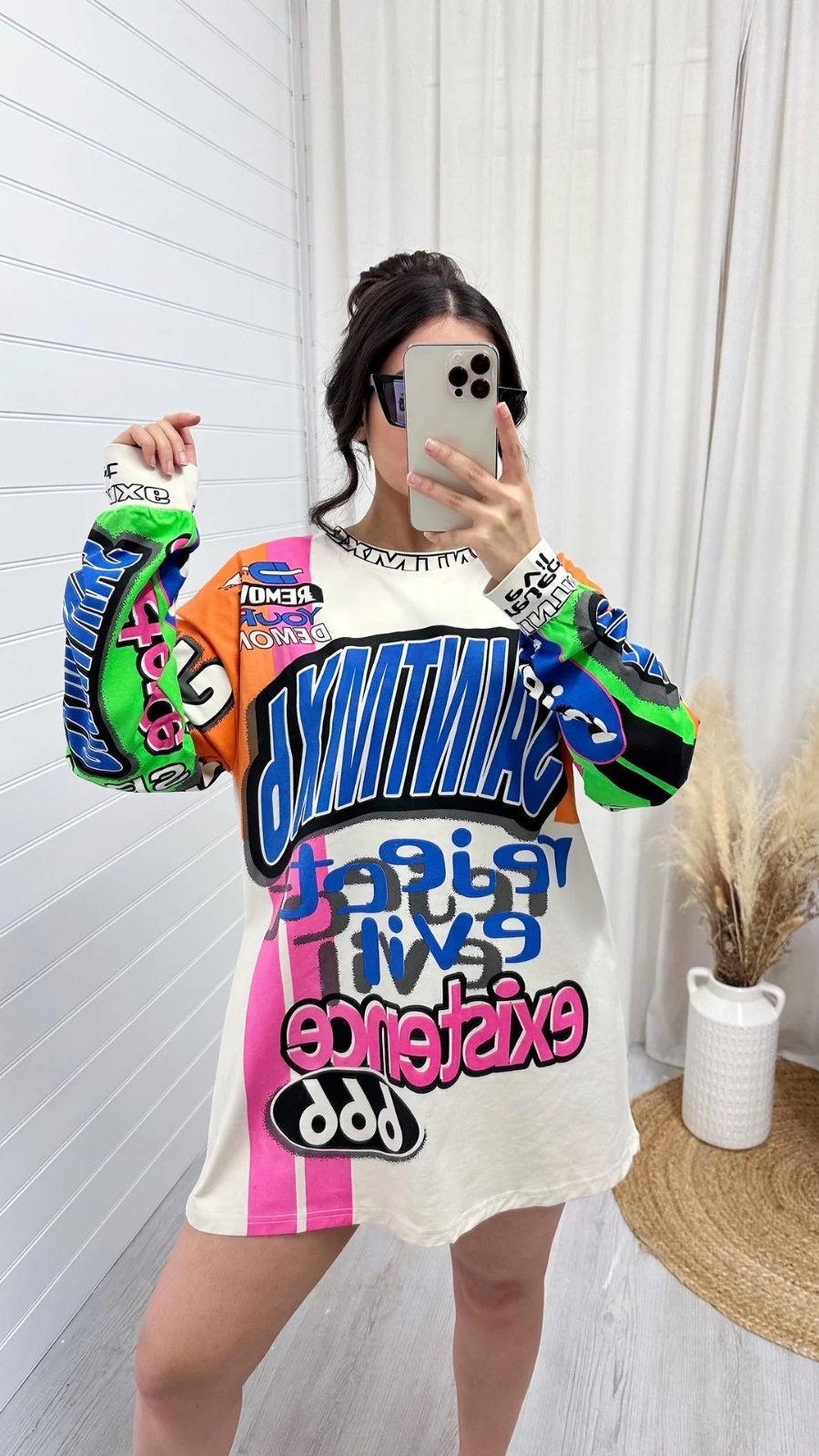 Άνετο cool oversized hoodie με πολύχρωμα σχέδια σε όλο το μήκος του διαθέσιμο σε δυο χρώματα λευκό και μαύρο και σε ένα μέγεθος one size που καλύπτει μεγέθη xs s m l xl.Μπορεί να φορεθεί και σαν φόρεμα συνδυασμένο με τις μπότες σου για ένα αθλητικό βραδινό look.